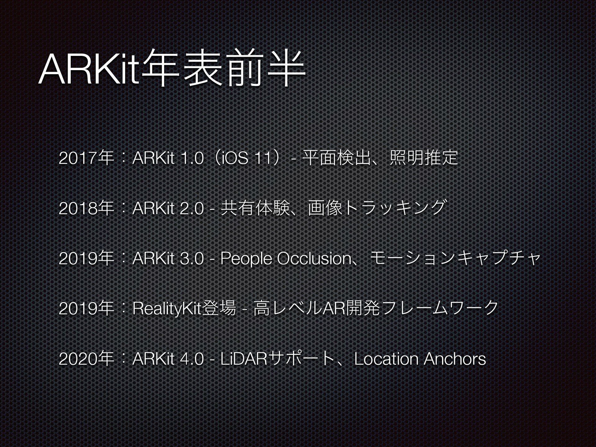 ARKitදલ 2017ɿARKit 1.0ʢiOS 11ʣ- ฏ໘ݕग़ɺর໌ਪఆ 2018ɿARKit 2.0 - ڞ༗ମݧɺը૾τϥοΩϯά 2019ɿARKit