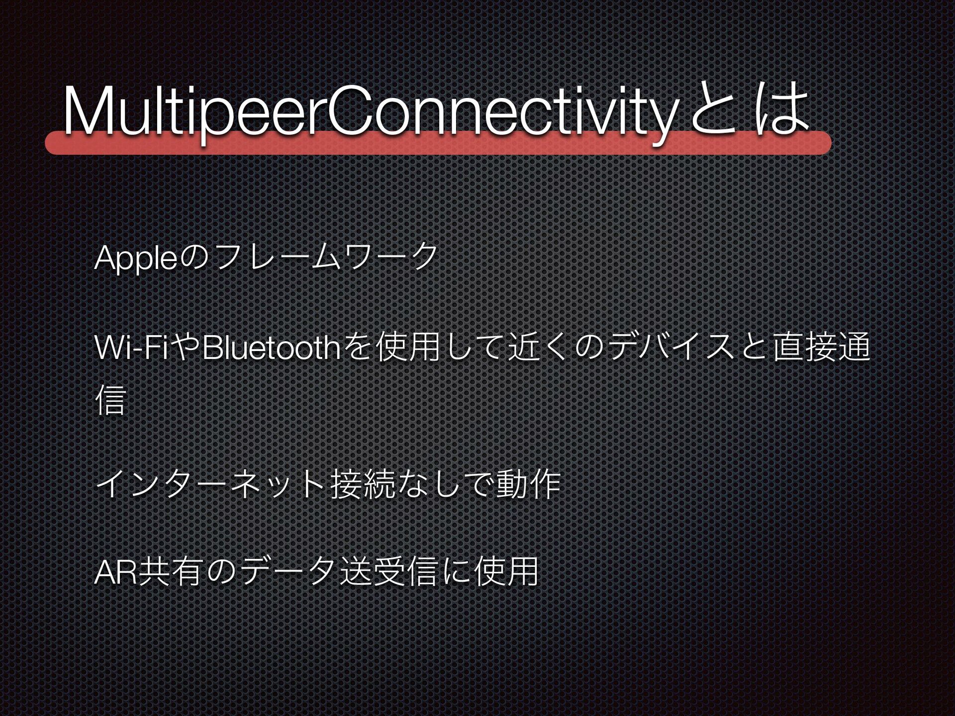 MultipeerConnectivityͱ AppleͷϑϨʔϜϫʔΫ Wi-FiBluetoothΛ༻ͯۙ͘͠ͷσόΠεͱ௨ ৴ Πϯλʔωοτଓͳ͠Ͱಈ࡞ ARڞ༗ͷσʔλૹड৴ʹ༻
