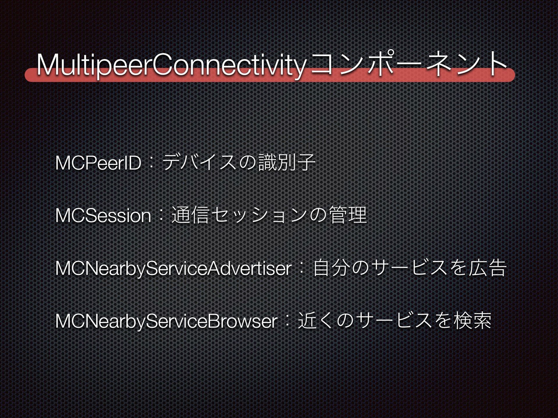 MultipeerConnectivityίϯϙʔωϯτ MCPeerIDɿσόΠεͷࣝผࢠ MCSessionɿ௨৴ηογϣϯͷཧ MCNearbyServiceAdvertiserɿࣗͷαʔϏεΛࠂ MCNearbyServiceBrowserɿۙ͘ͷαʔϏεΛݕࡧ
