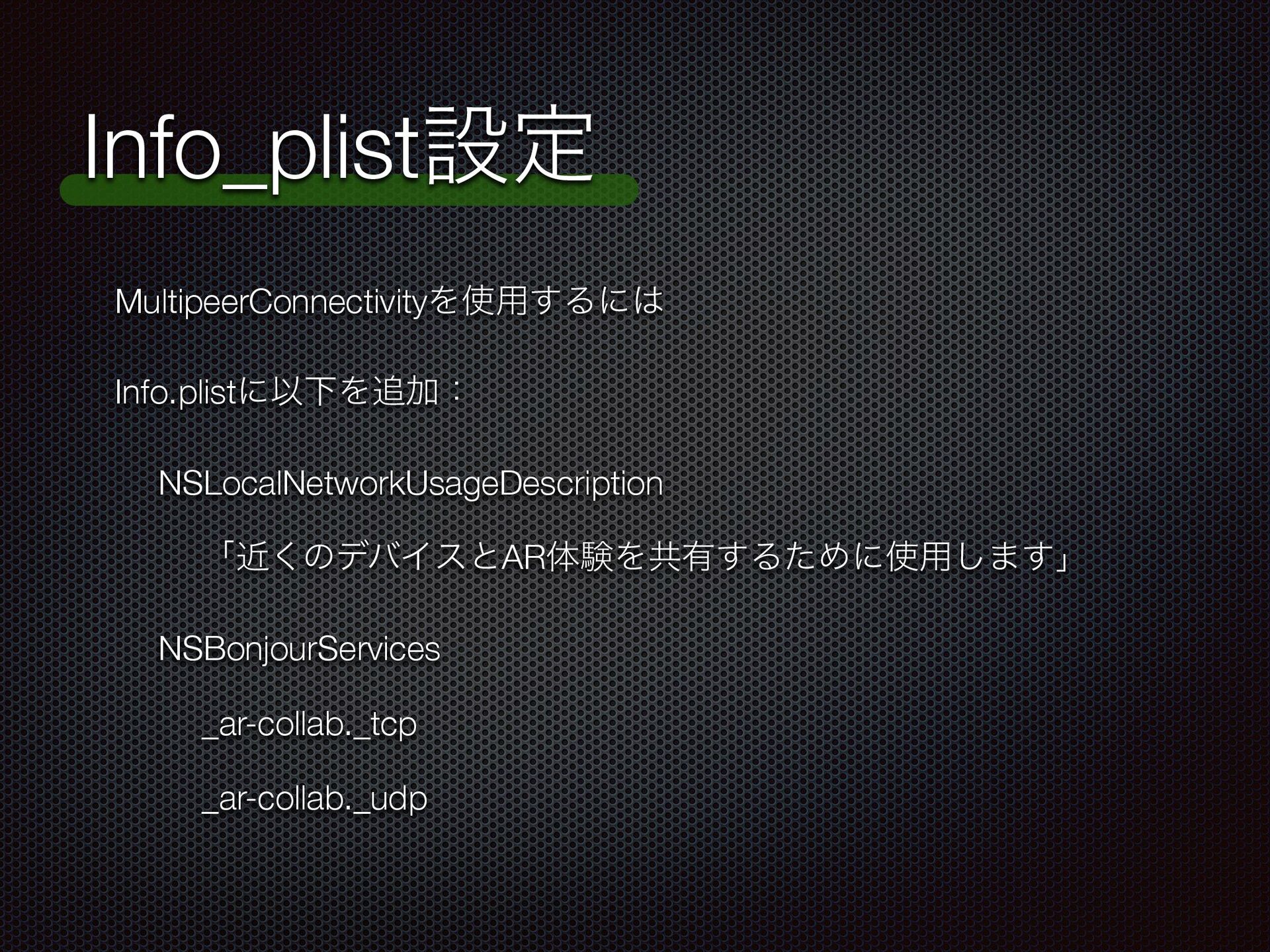 Info_plistઃఆ MultipeerConnectivityΛ༻͢Δʹ Info.plistʹҎԼΛՃɿ NSLocalNetworkUsageDescription ʮۙ͘ͷσόΠεͱARମݧΛڞ༗͢ΔͨΊʹ༻͠·͢ʯ NSBonjourServices _ar-collab._tcp _ar-collab._udp