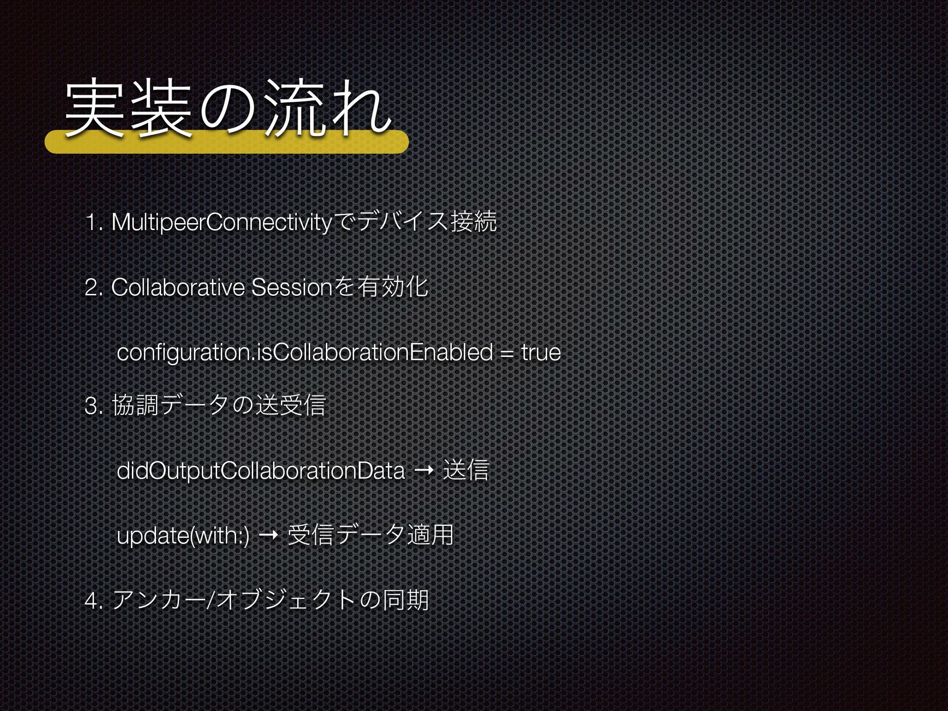 ࣮ͷྲྀΕ 1. MultipeerConnectivityͰσόΠεଓ 2. Collaborative SessionΛ༗ޮԽ con fi guration.isCollaborationEnabled =