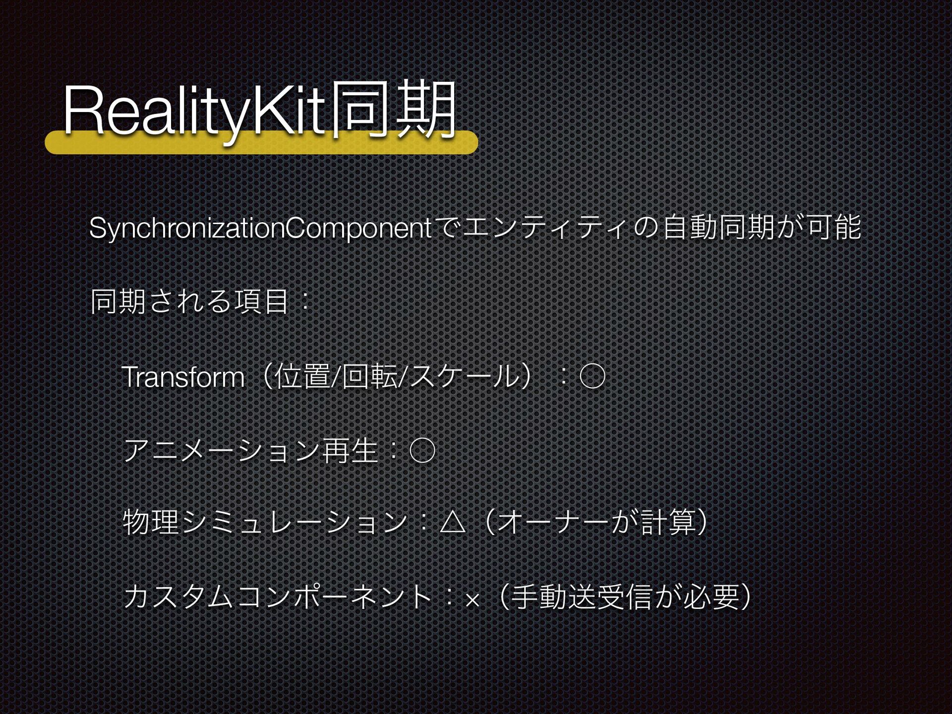 RealityKitಉظ SynchronizationComponentͰΤϯςΟςΟͷࣗಈಉظ͕Մೳ ಉظ͞ΕΔ߲ɿ TransformʢҐஔ/ճస/εέʔϧʣɿ˓ Ξχϝʔγϣϯ࠶ੜɿ˓ ཧγϛϡϨʔγϣϯɿ˚ʢΦʔφʔ͕ܭࢉʣ ΧελϜίϯϙʔωϯτɿ×ʢखಈૹड৴͕ඞཁʣ