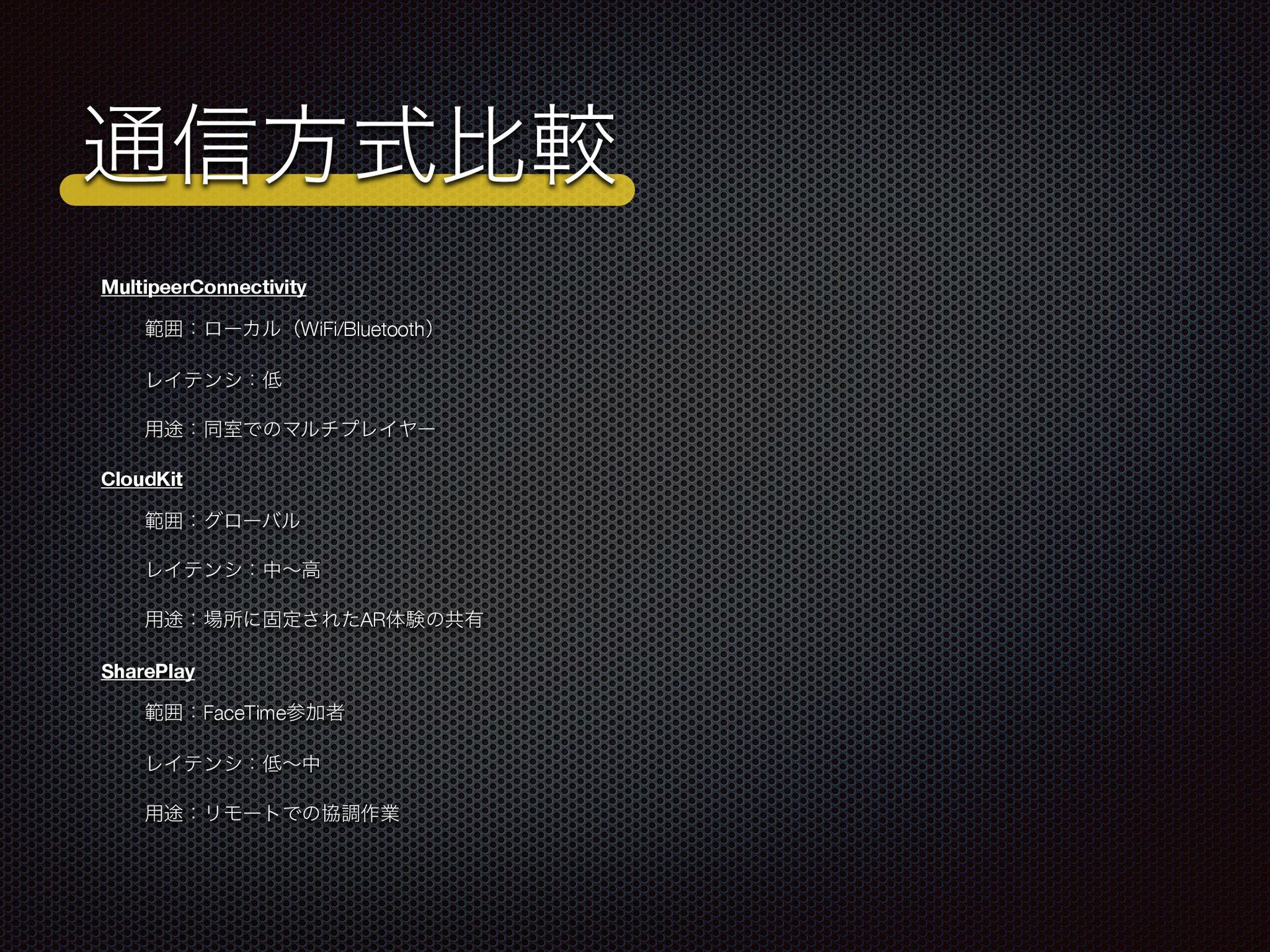 ௨৴ํࣜൺֱ MultipeerConnectivity ൣғɿϩʔΧϧʢWiFi/Bluetoothʣ ϨΠςϯγɿ ༻్ɿಉࣨͰͷϚϧνϓϨΠϠʔ CloudKit ൣғɿάϩʔόϧ ϨΠςϯγɿதʙߴ ༻్ɿॴʹݻఆ͞ΕͨARମݧͷڞ༗ SharePlay