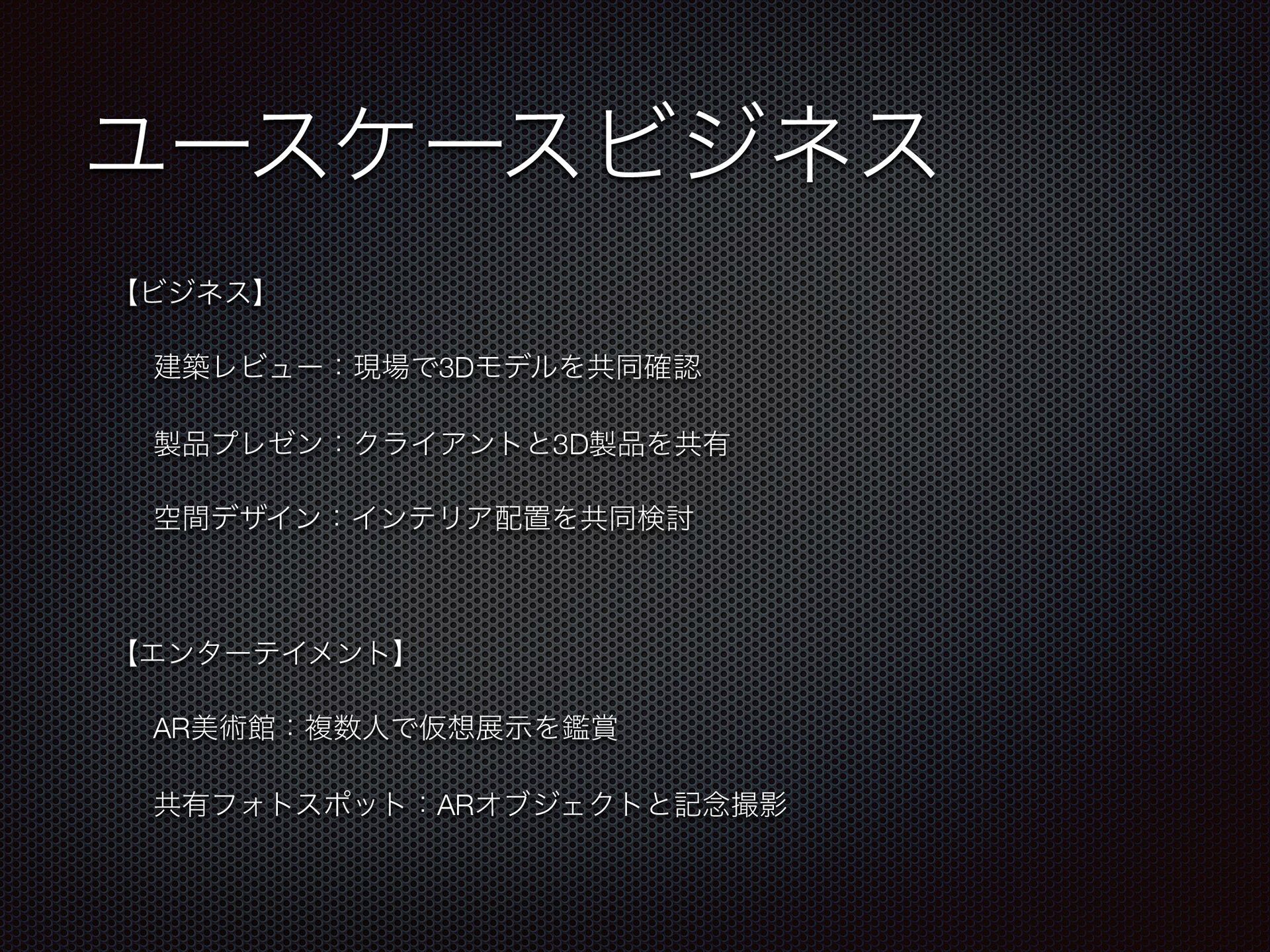 ϢʔεέʔεϏδωε ʲϏδωεʳ ݐஙϨϏϡʔɿݱͰ3DϞσϧΛڞಉ֬ೝ ϓϨθϯɿΫϥΠΞϯτͱ3DΛڞ༗ ۭؒσβΠϯɿΠϯςϦΞஔΛڞಉݕ౼ ʲΤϯλʔςΠϝϯτʳ ARඒज़ؗɿෳਓͰԾలࣔΛؑ ڞ༗ϑΥτεϙοτɿARΦϒδΣΫτͱه೦ࡱӨ