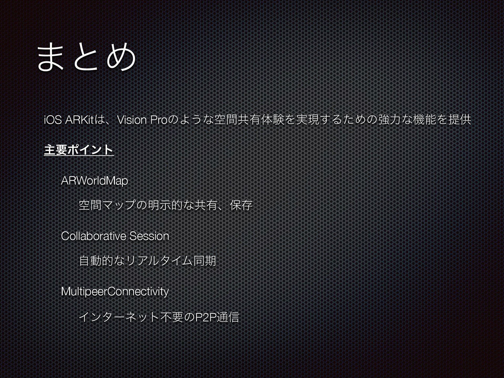 ·ͱΊ iOS ARKitɺVision ProͷΑ͏ͳۭؒڞ༗ମݧΛ࣮ݱ͢ΔͨΊͷڧྗͳػೳΛఏڙ ओཁϙΠϯτ ARWorldMap ۭؒϚοϓͷ໌ࣔతͳڞ༗ɺอଘ Collaborative Session ࣗಈతͳϦΞϧλΠϜಉظ