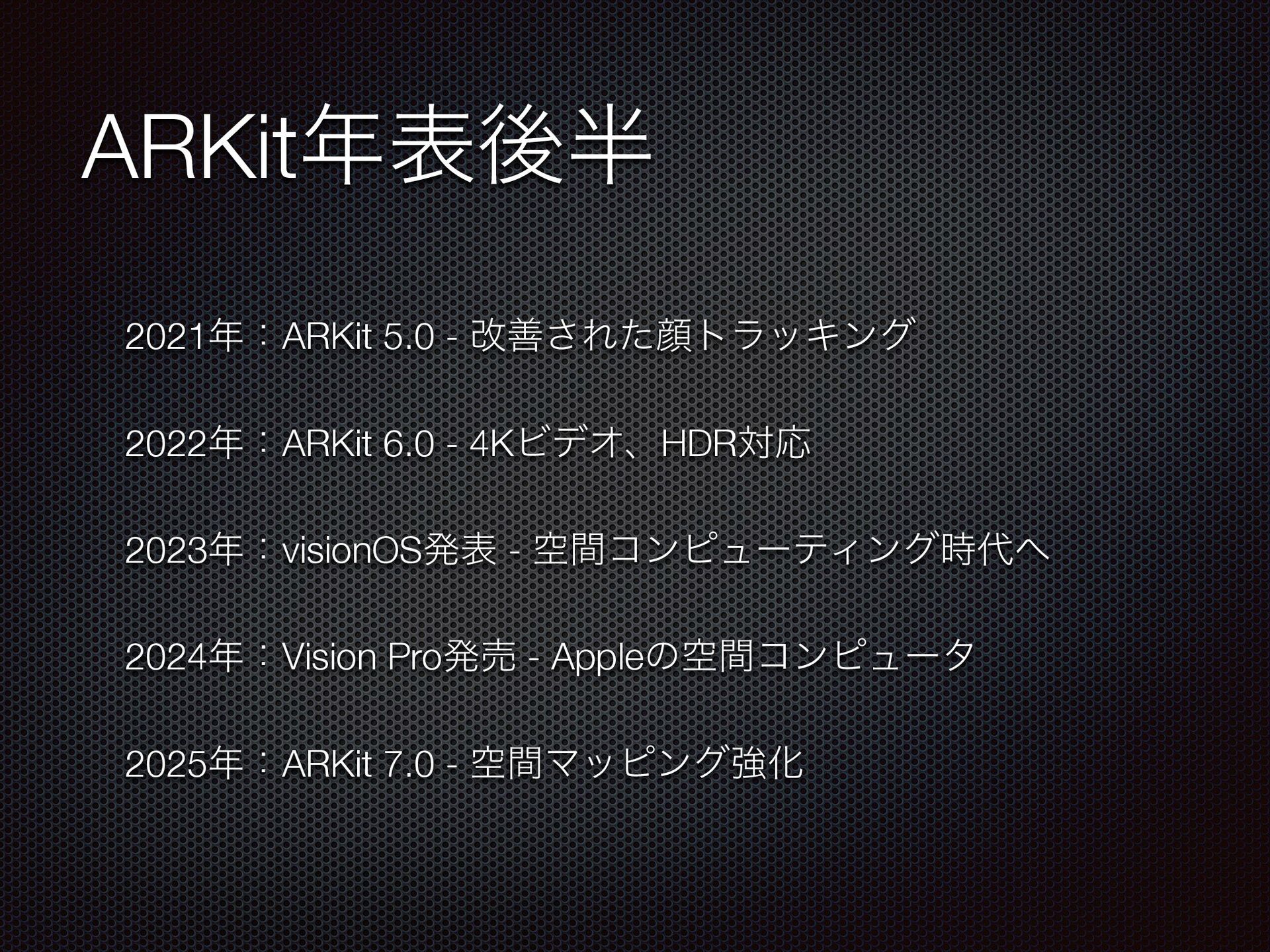 ARKitදޙ 2021ɿARKit 5.0 - վળ͞ΕͨإτϥοΩϯά 2022ɿARKit 6.0 - 4KϏσΦɺHDRରԠ 2023ɿvisionOSൃද