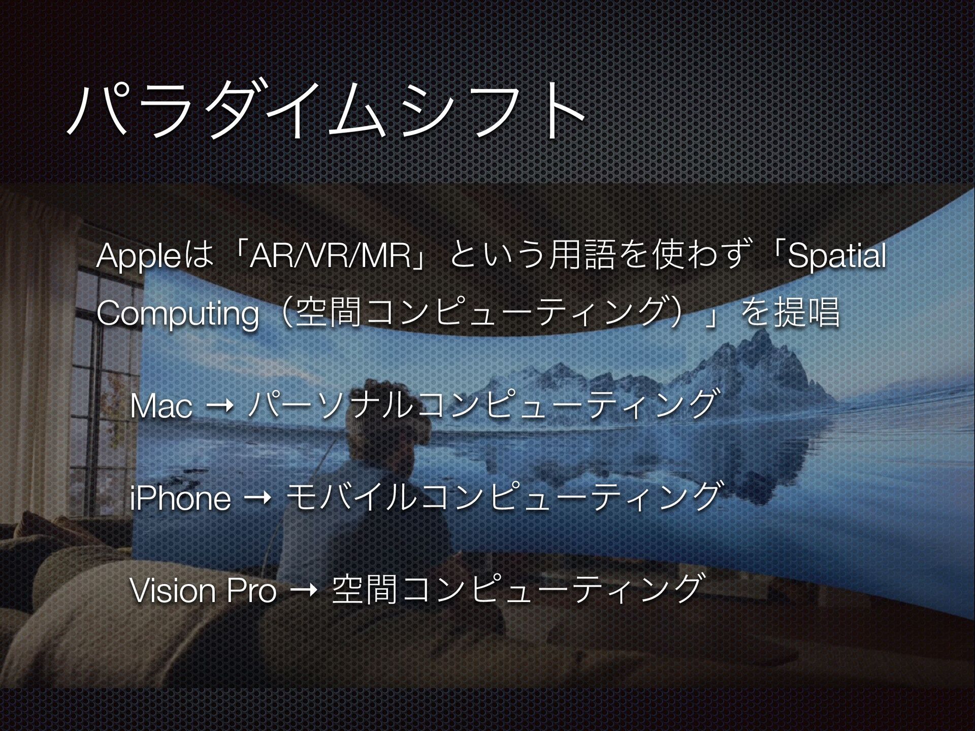 ύϥμΠϜγϑτ AppleʮAR/VR/MRʯͱ͍͏༻ޠΛΘͣʮSpatial ComputingʢۭؒίϯϐϡʔςΟϯάʣʯΛఏএ Mac → ύʔιφϧίϯϐϡʔςΟϯά iPhone → ϞόΠϧίϯϐϡʔςΟϯά Vision
