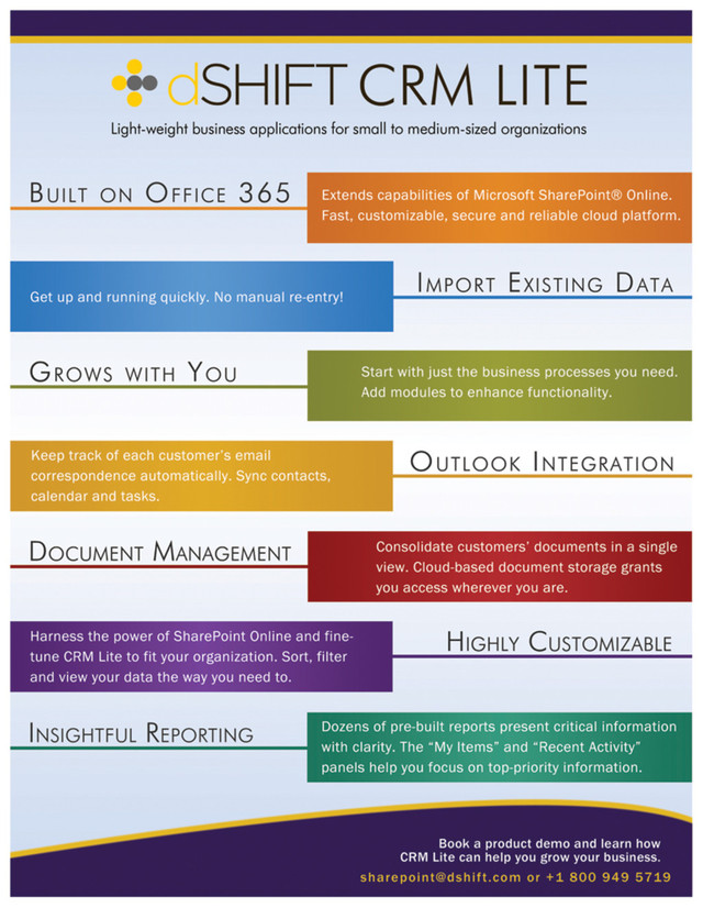 dSHIFT CRM Lite is a powerful solution for managing customer and lead information. By building on the superior knowledge-sharing and document management capabilities of Office 365, CRM Lite offers a cloud-based, consolidated information repository for all of your customer information.