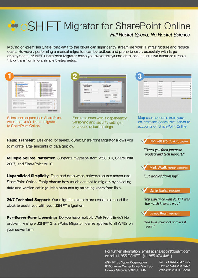 Moving on-premises SharePoint data to the cloud can significantly streamline your IT infrastructure and reduce costs. However, performing a manual migration can be tedious and prone to error, especially with large deployments. dSHIFT SharePoint Migrator helps you avoid delays and data loss. Its intuitive interface turns a tricky transition into a simple 3-step setup