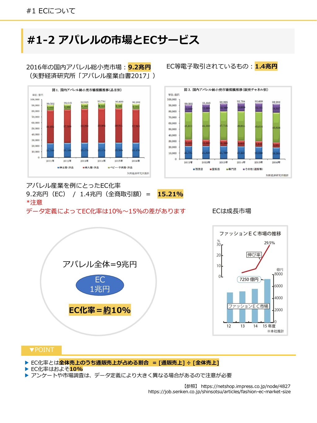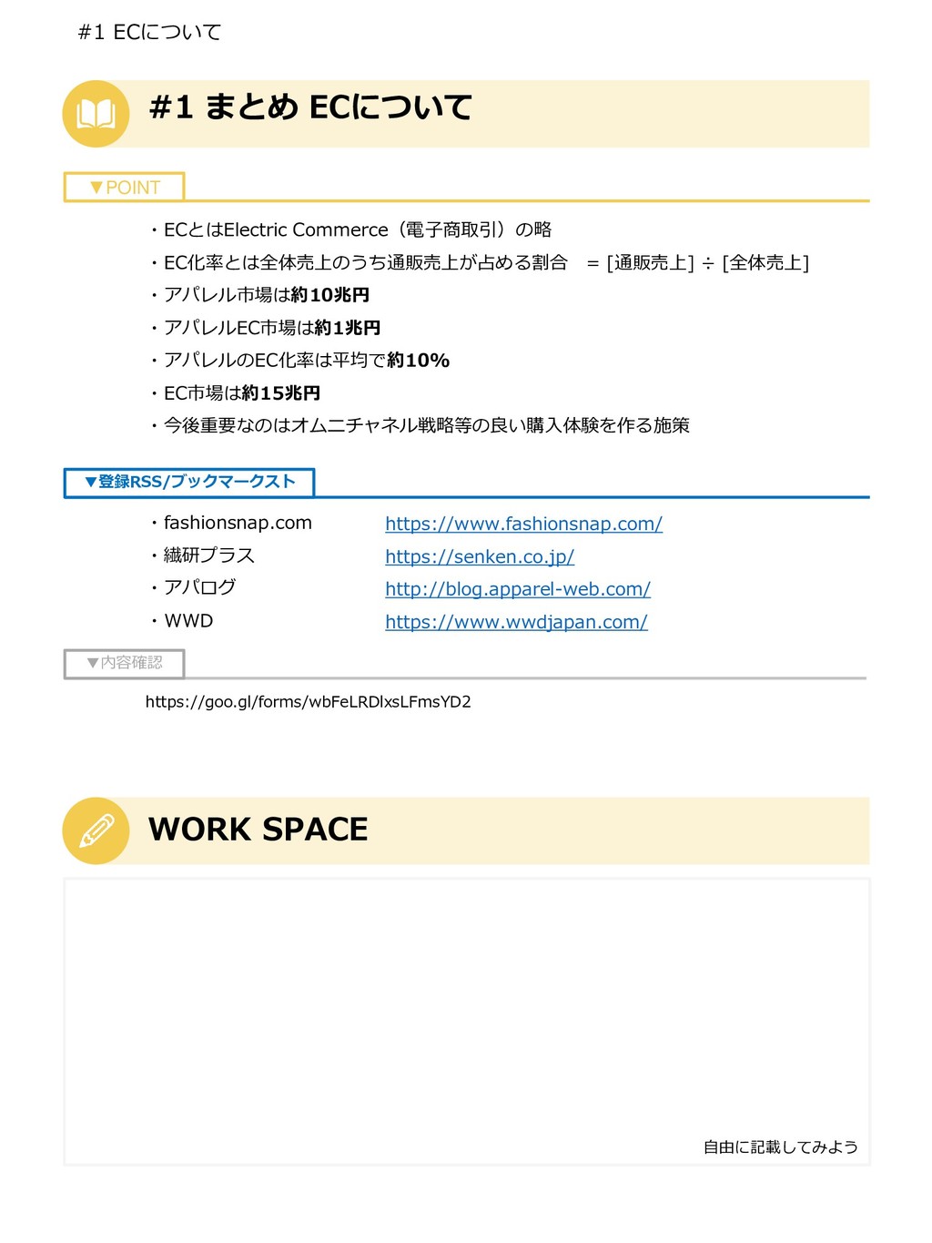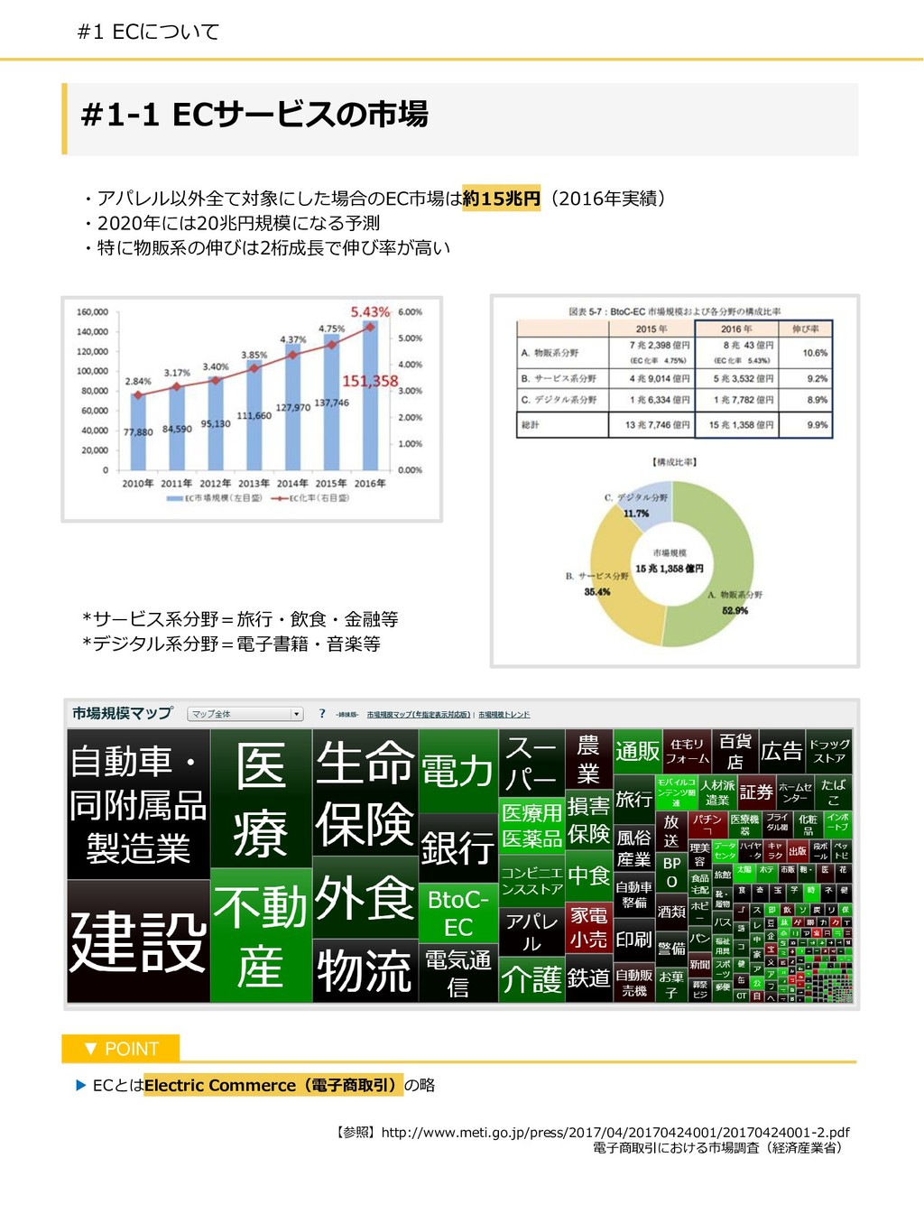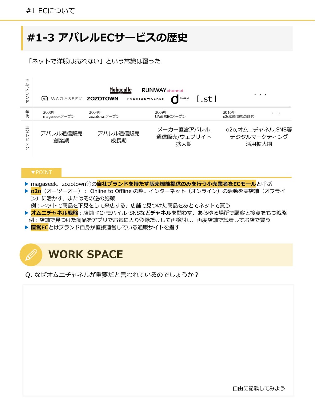 ン)に活かす、またはその逆の施策 例:ネットで商品を下見をして来店する、店舗で見つけた商品をあとでネットで買う ▶ オムニチャネル戦略:店舗・PC・モバイル・SNSなどチャネルを問わず、あらゆる場所で顧客と接点をもつ戦略 例:店舗で見つけた商品をアプリでお気に入り登録だけして再検討し、再度店舗で試着してお店で買う ▶ 直営ECとはブランド自身が直接運営している通販サイトを指す ▼POINT #1 ECについて #1-3 アパレルECサービスの歴史 ・・・ アパレル通信販売 創業期 アパレル通信販売 成長期 メーカー直営アパレル 通信販売/ウェブサイト 拡大期 o2o,オムニチャネル,SNS等 デジタルマーケティング 活用拡大期 2000年 magaseekオープン 2004年 zozotownオープン 2009年 UA直営ECオープン 2016年 o2o戦略重視の時代 年 代 主 な ブ ラ ン ド 主 な ト ピ ッ ク Q. なぜオムニチャネルが重要だと言われているのでしょうか? WORK SPACE 自由に記載してみよう