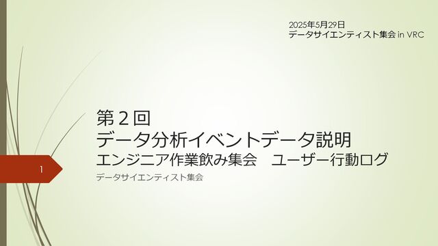 第2回 データ分析イベントデータ説明 エンジニア作業飲み集会 ユーザー行動ログ データサイエンティスト集会 2025年5月29日 データサイエンティスト集会 in VRC 1