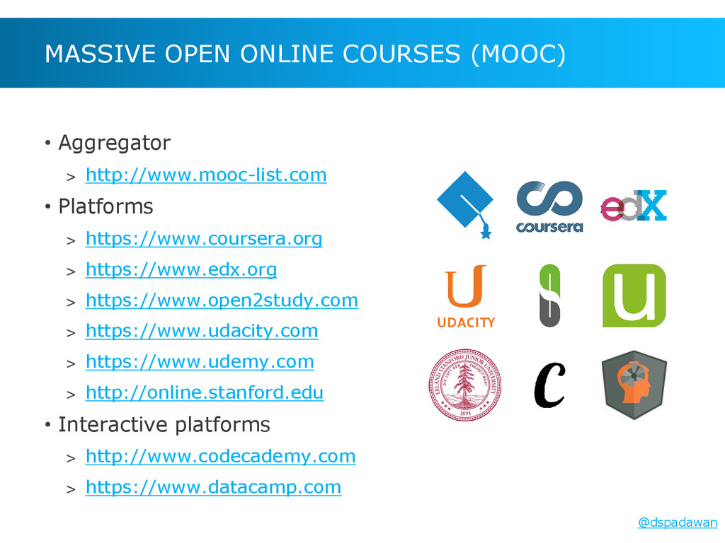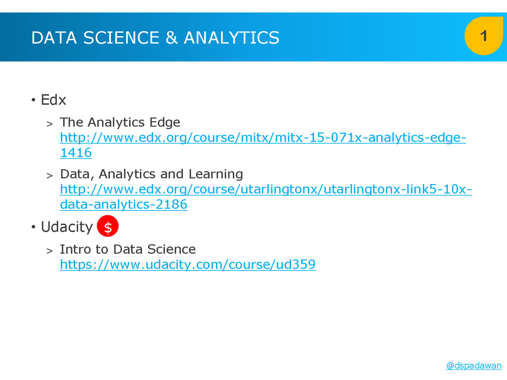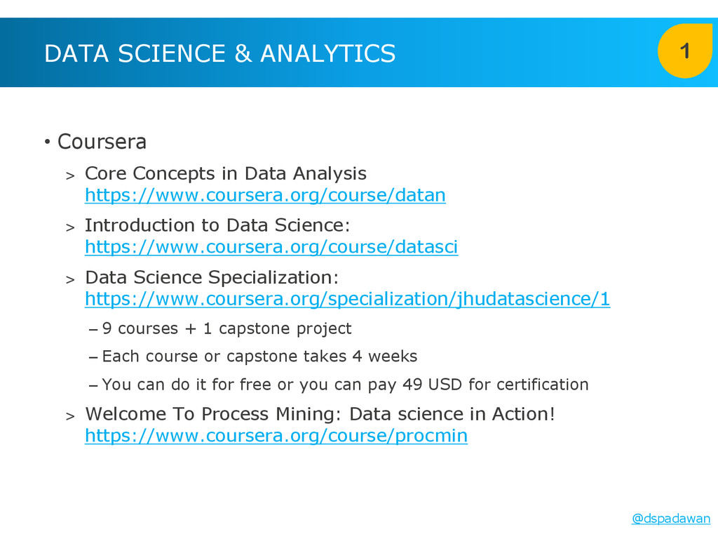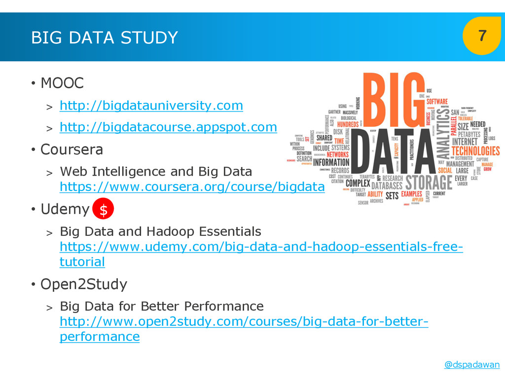 Big Data and Data Science study with subtitle "study materials and online courses" is little bit more over 40 slides presentation about 10 domains of Data Science covered by online free and paid MOOC courses, study materials and free books.