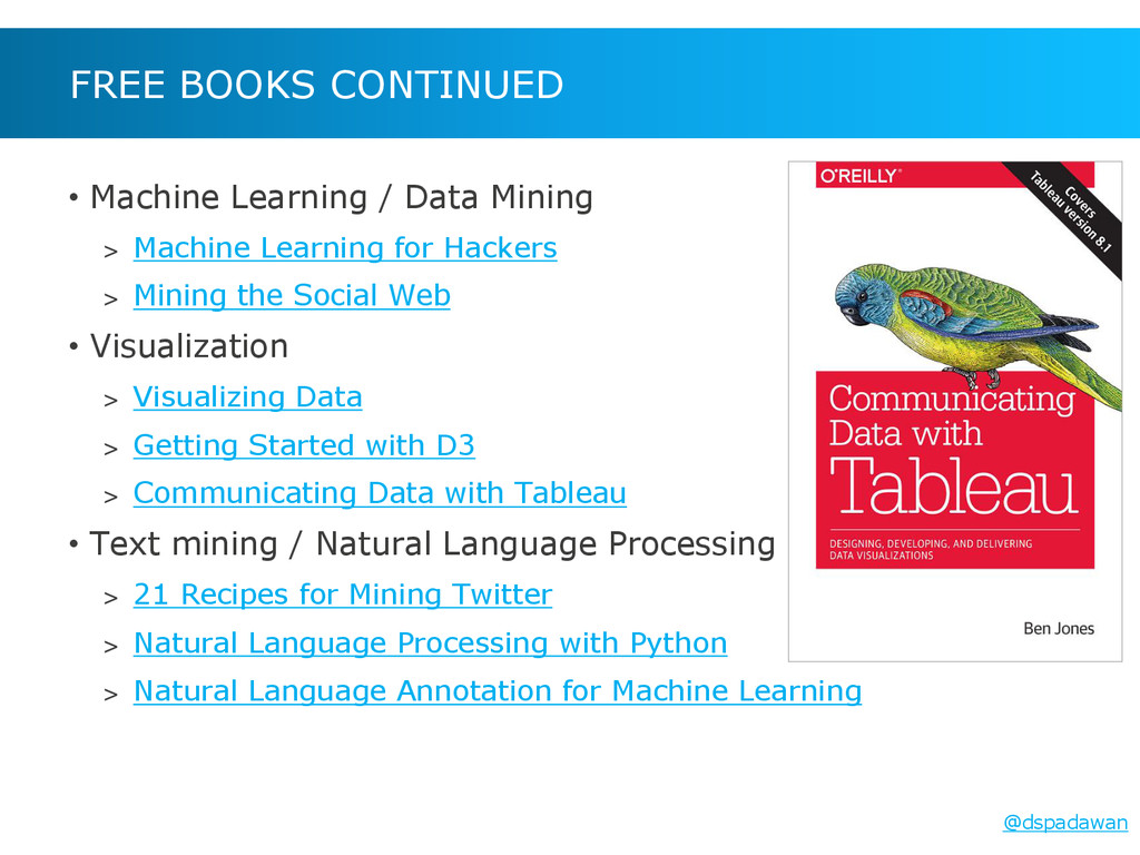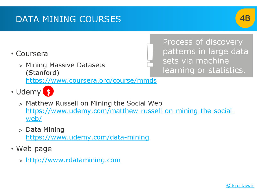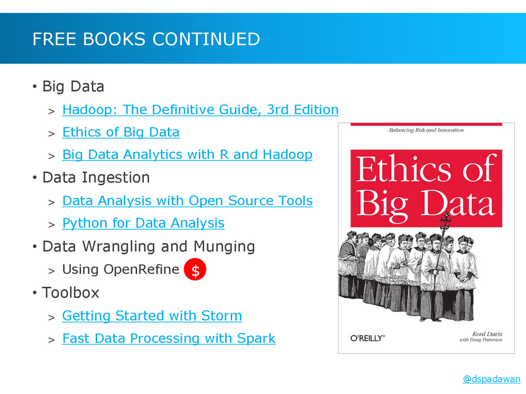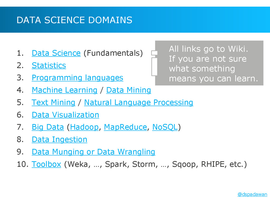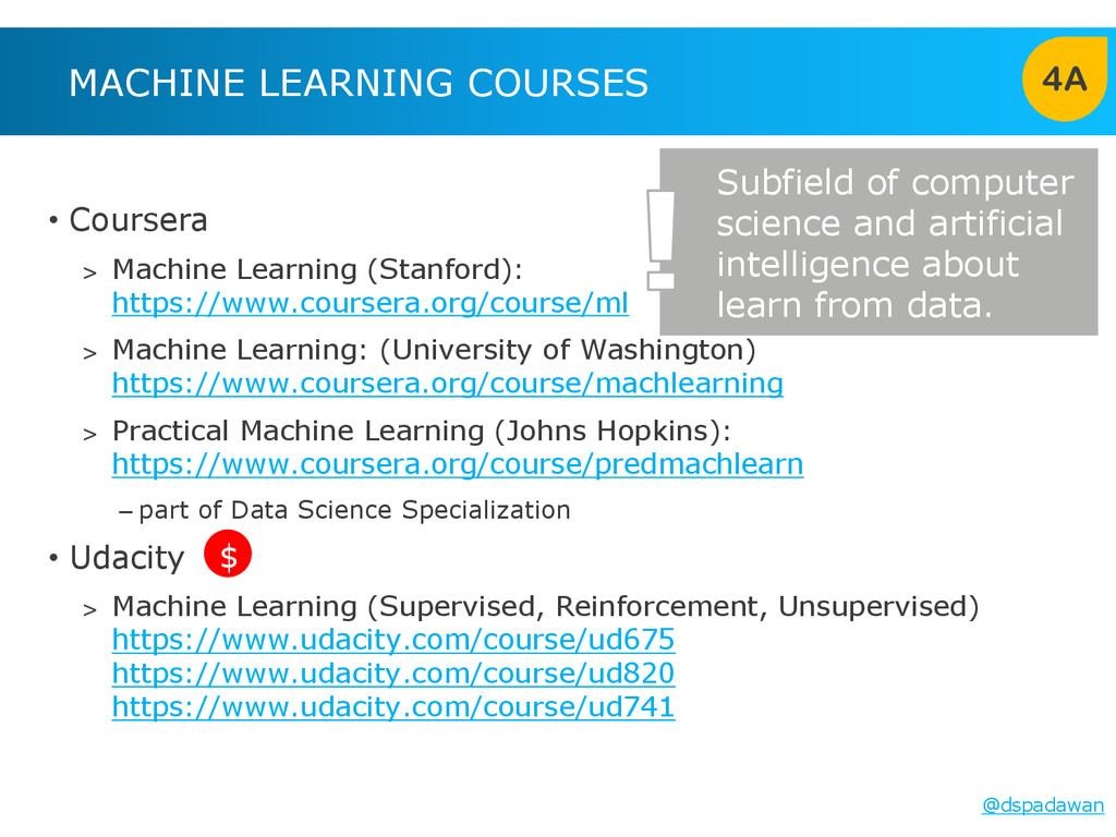 Big Data and Data Science study with subtitle "study materials and online courses" is little bit more over 40 slides presentation about 10 domains of Data Science covered by online free and paid MOOC courses, study materials and free books.