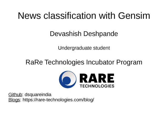News classification with Gensim Devashish Deshpande Undergraduate student RaRe Technologies