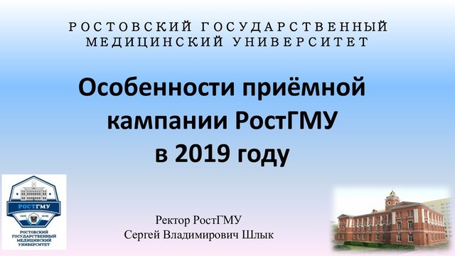 русского университета в г. Ростов-на-Дону и начало работы медицинского факультета (7-я по старшинству медицинская школа в Российской Федерации). • 1930 год – создание Ростовского медицинского института • 1980 год – награжден орденом Дружбы народов • 1994 год – преобразование в университет • 2015 год - координатор научно-образовательного медицинского кластера ЮФО - «Южный» • 2017 год – присоединение к РостГМУ РНИИАП • 10 факультетов, учебный военный центр и колледж • Собственная клиника на 1000 коек. • Третий по величине бюджетный прием среди медицинских ВУЗов РФ