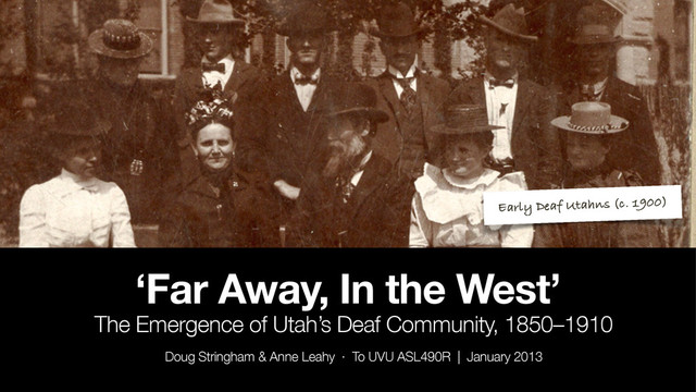 Presentation given to Utah Valley University ASL/Deaf Studies students about the emergence of the Utah Deaf protocommunity from 1850–1910. (Publication pending.)