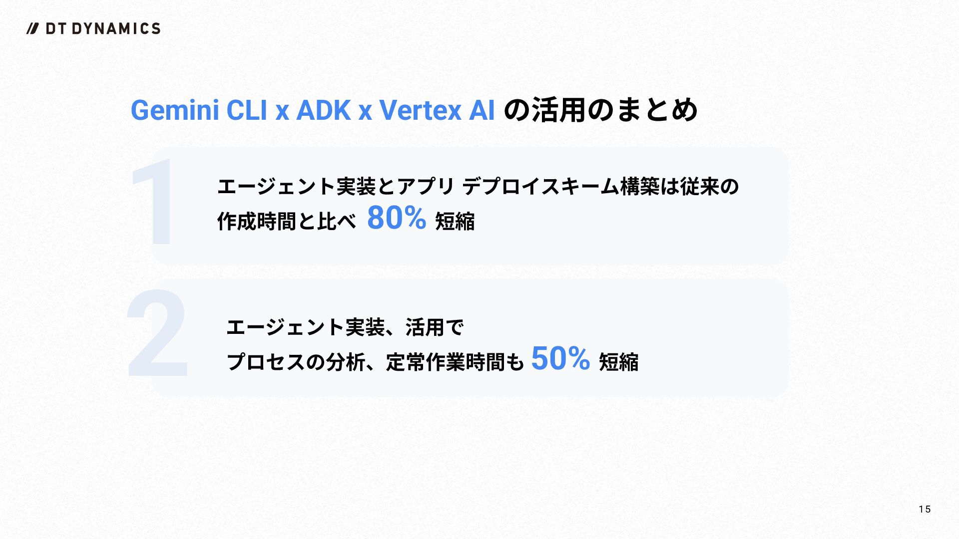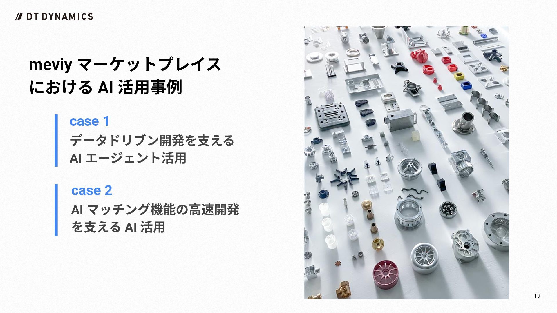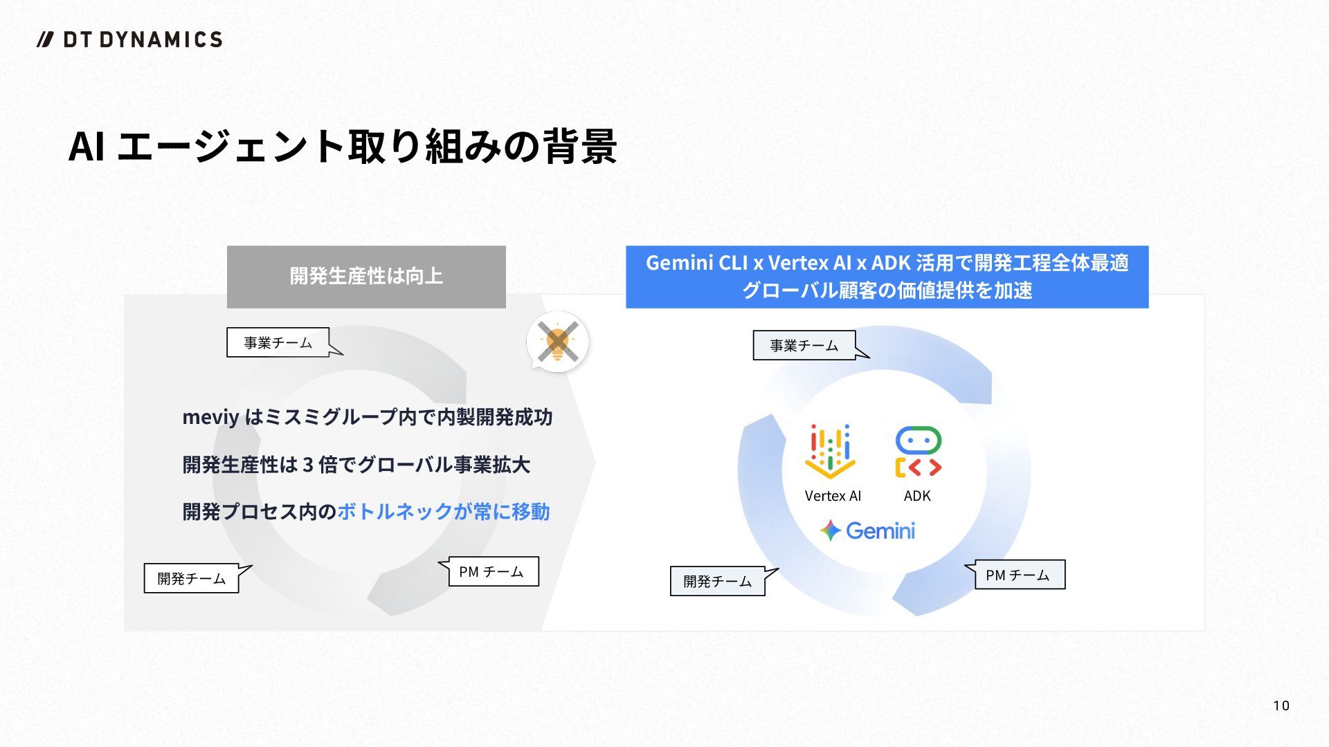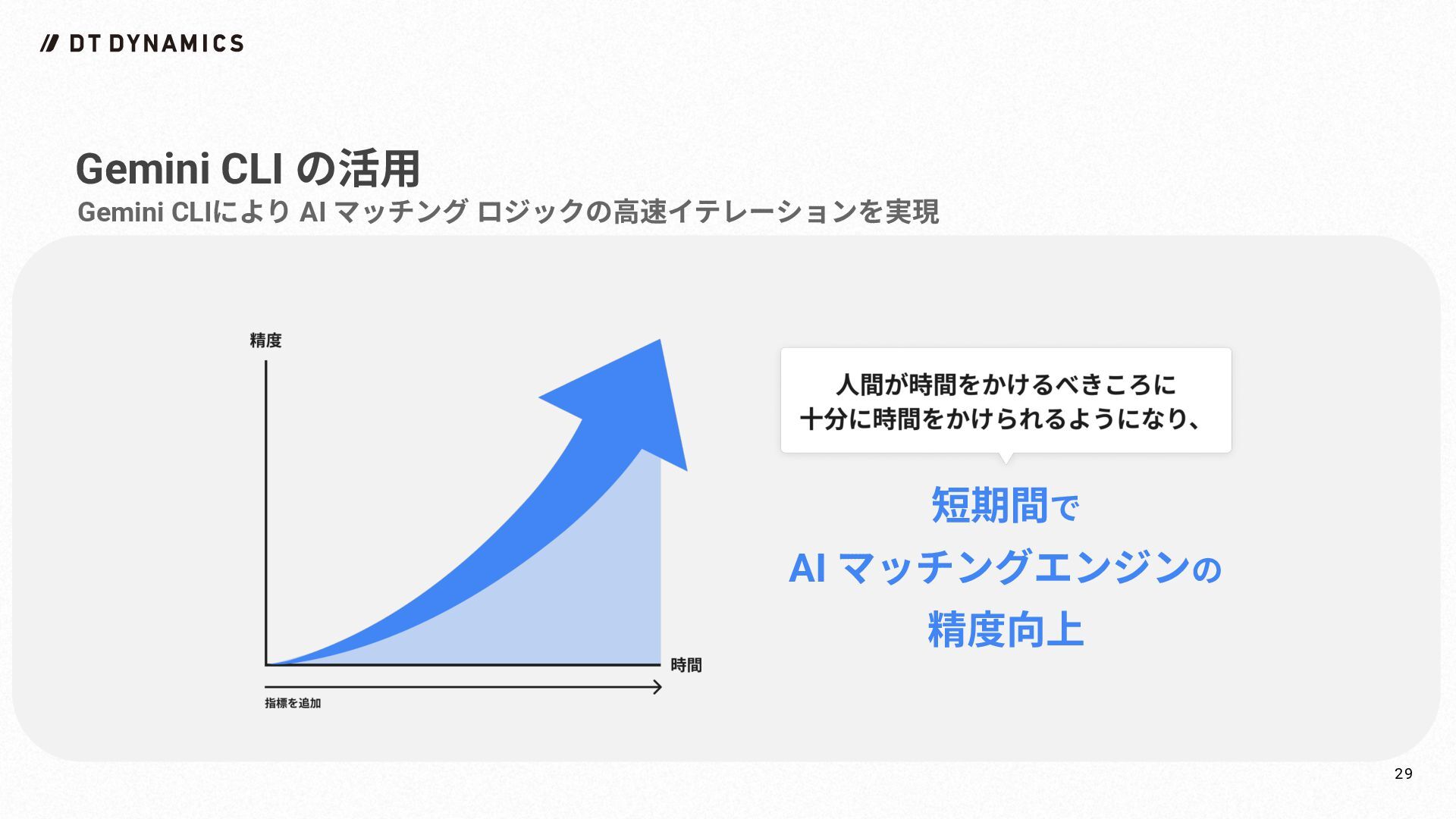 Gemini CLI、Vertex AI、ADK を活用したAIエージェントの導入により、開発生産性は大幅に向上し、属人化していた業務の形式化や、データドリブンな意思決定の高速化を実現しています。さらに、meviyマーケットプレイスにおけるAIマッチングや分析支援など、事業価値に直結するAI活用の実践例も紹介します。