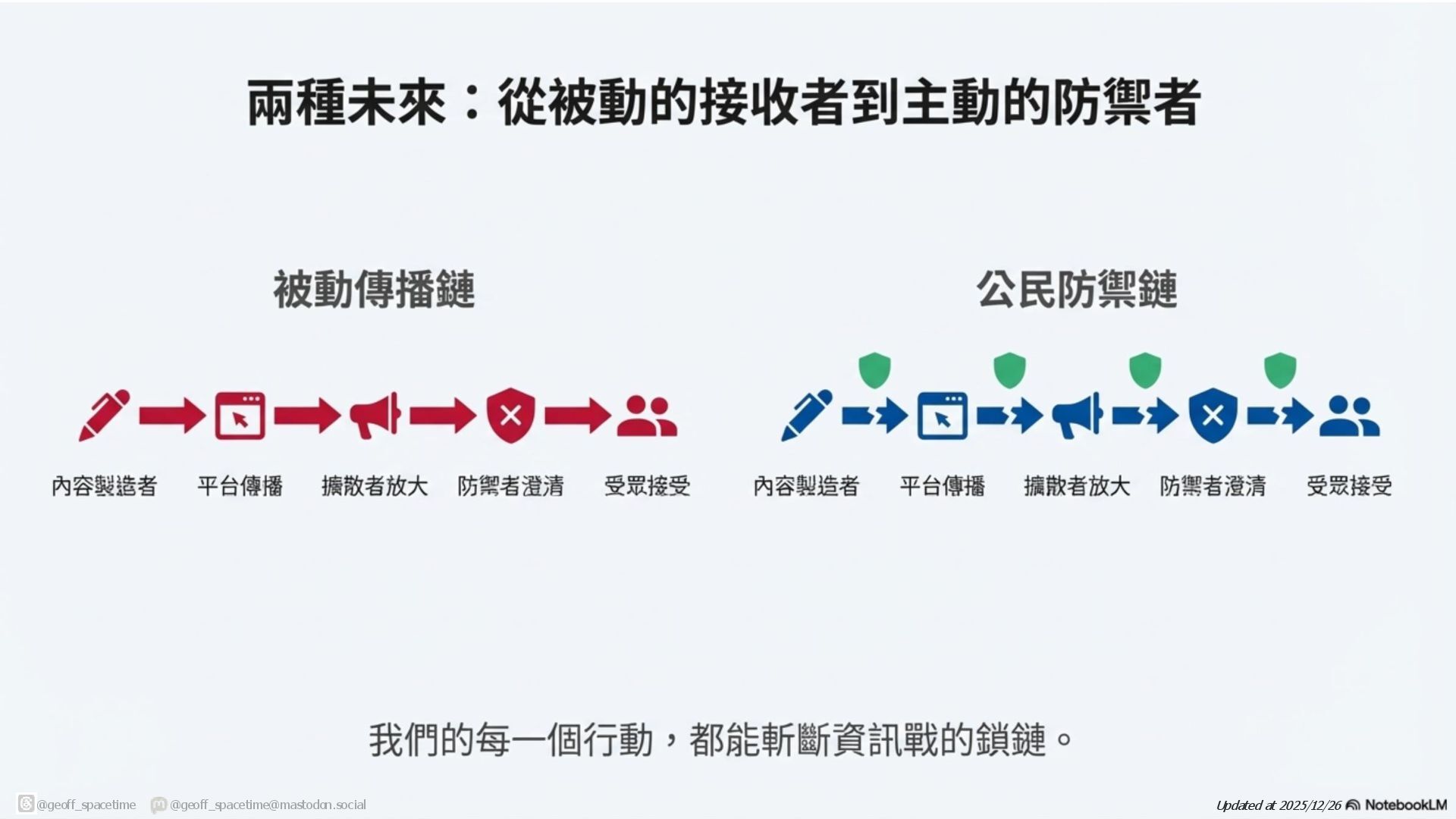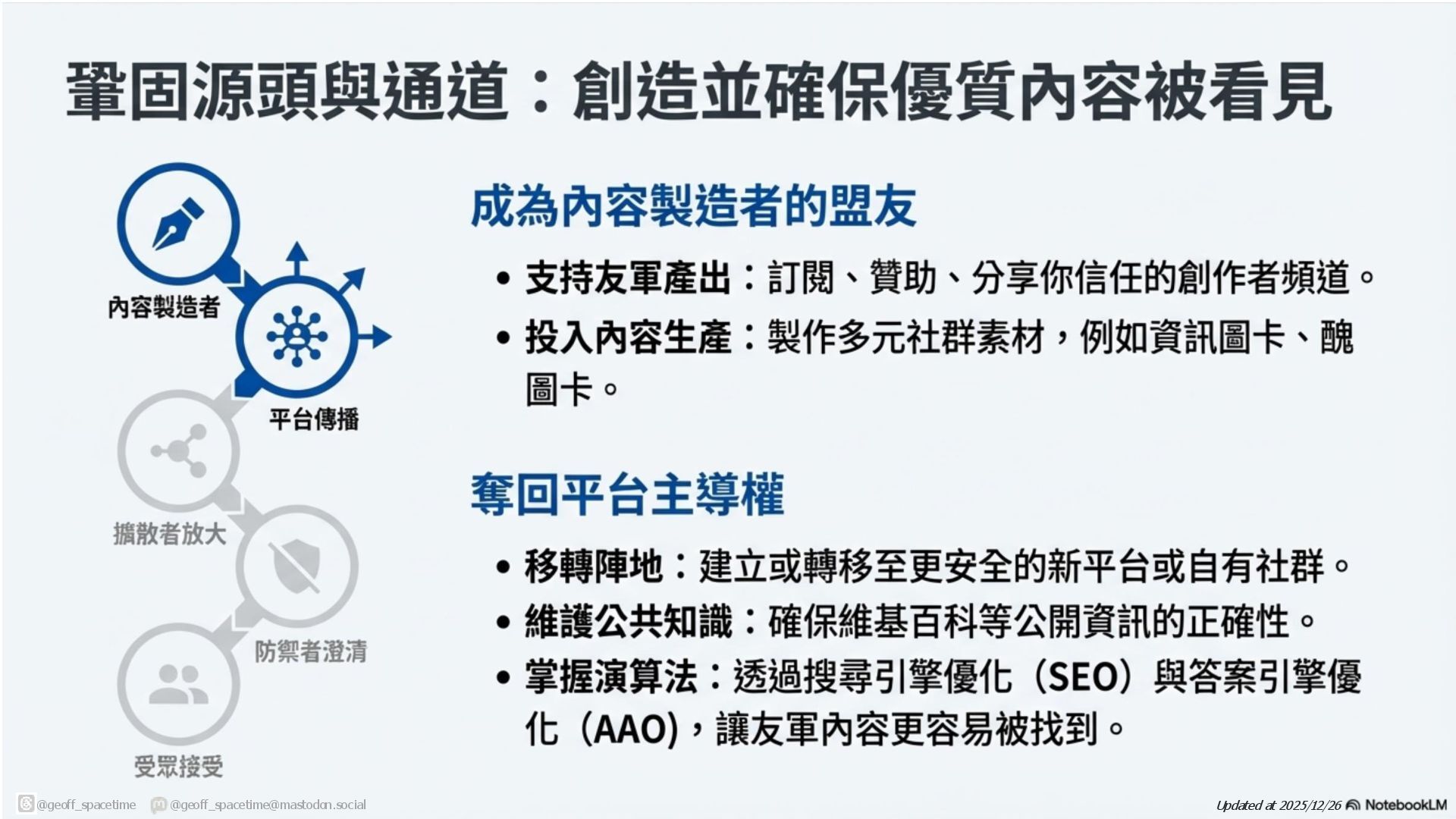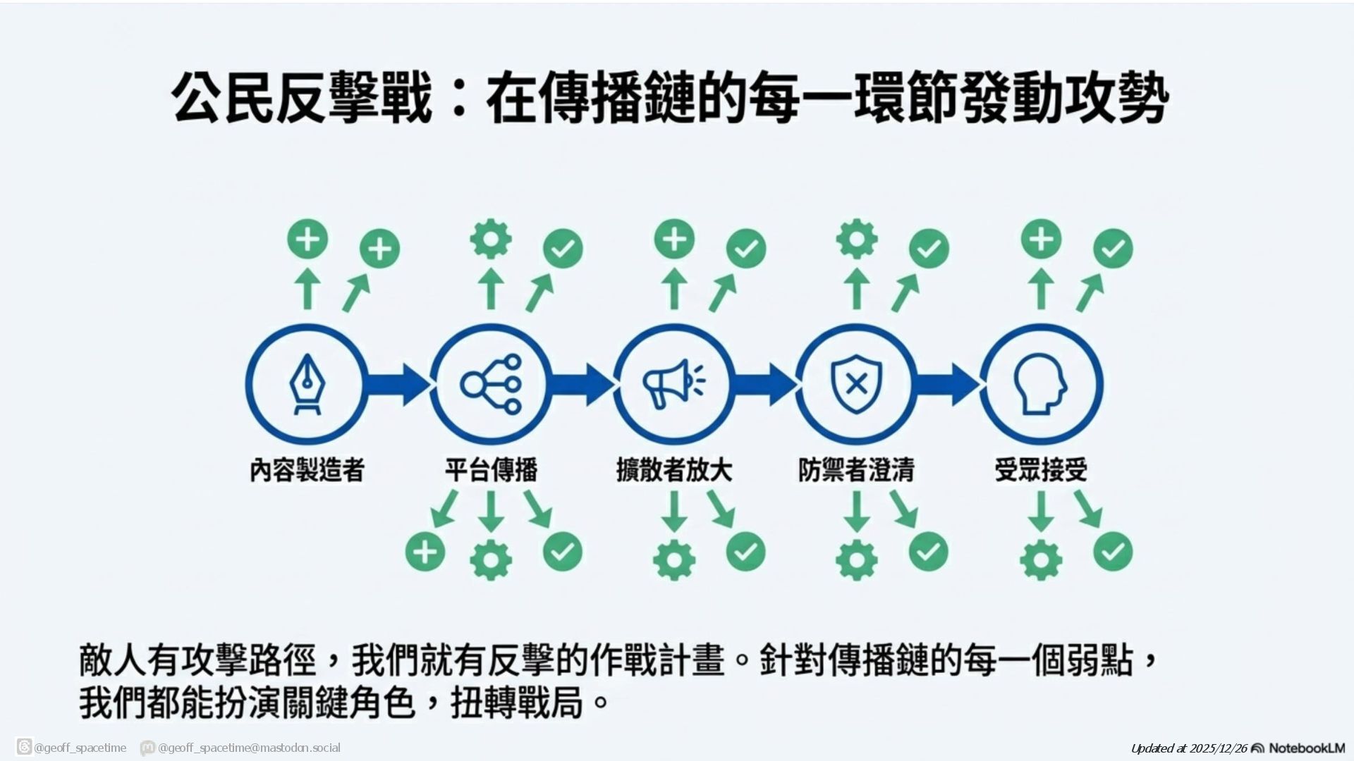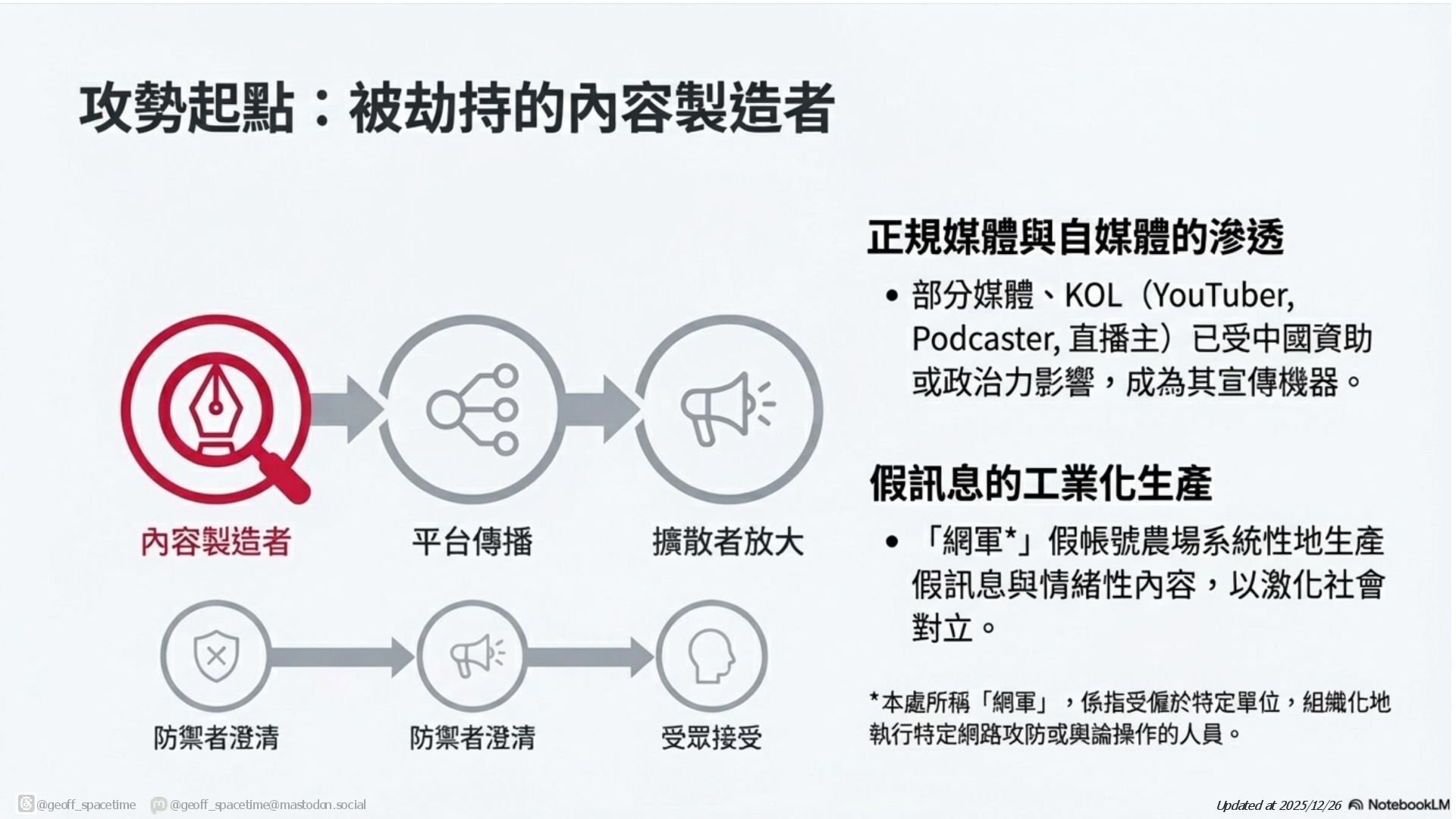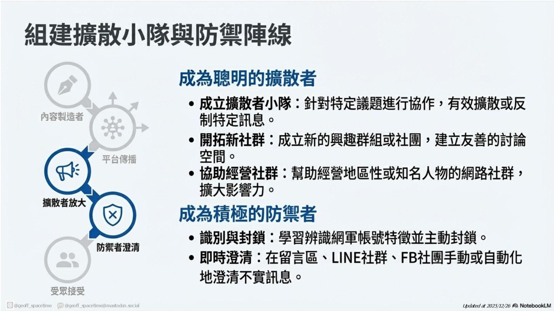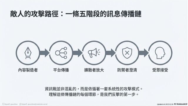 這份簡報剖析網路資訊戰傳播鏈,揭露內容產製者與擴散者(如網軍)如何利用平台演算法放大假訊息。針對現有防禦機制(如政府、查核單位)功能受限的困境,提出社群反擊策略:透過支持友軍內容、優化搜尋引擎與AI詢答 (SEO/AAO)、識別與封鎖網軍以及在私人群組中進行手動或自動澄清,以鞏固群眾信任並跨越同溫層傳遞正確資訊,。