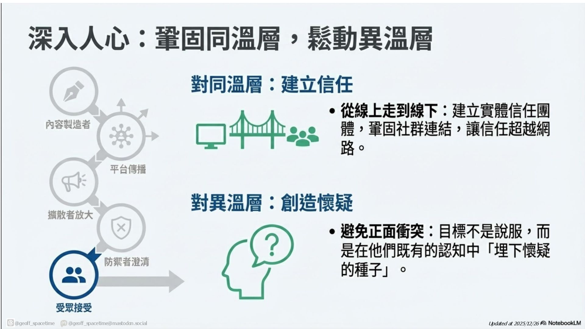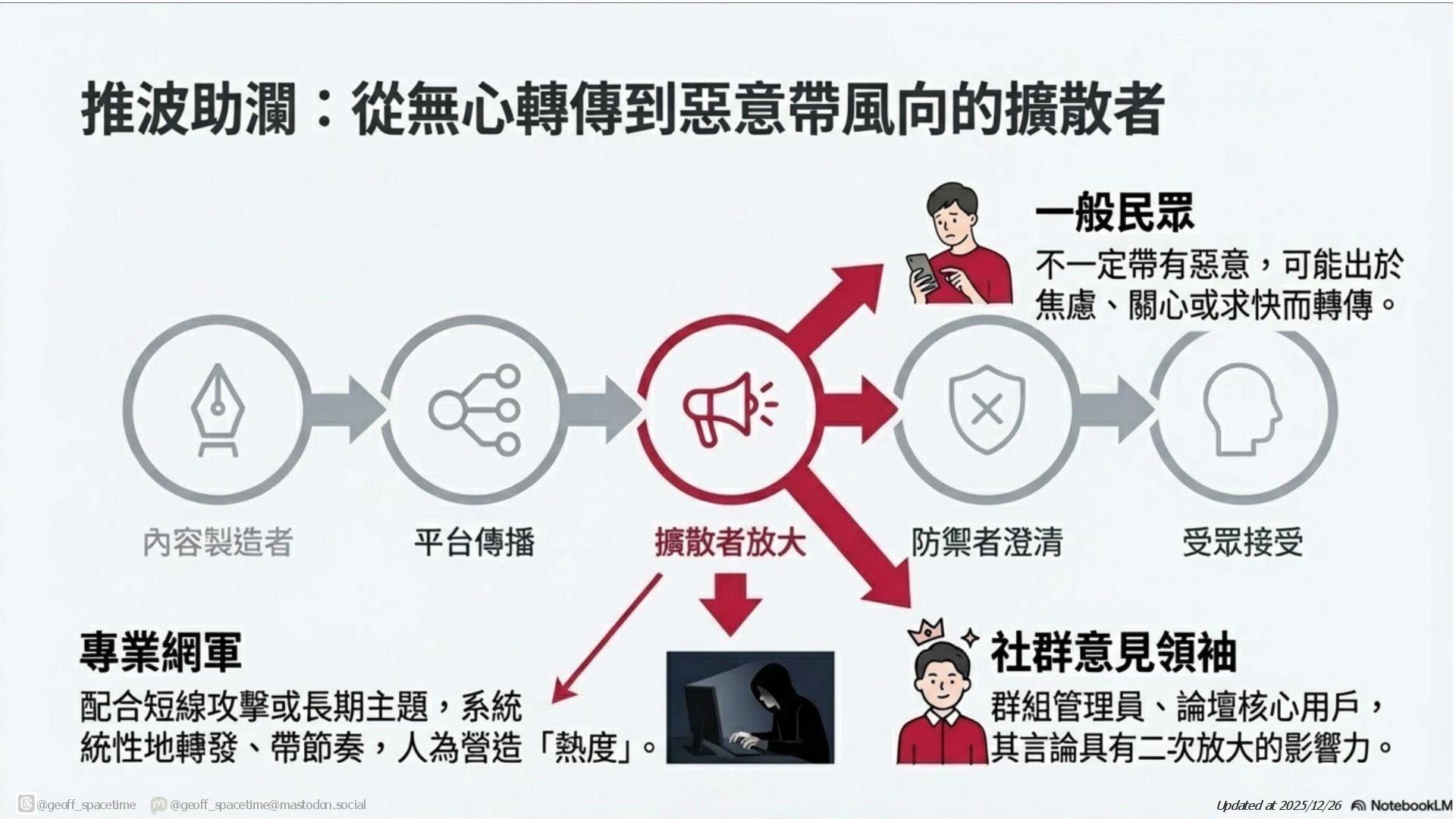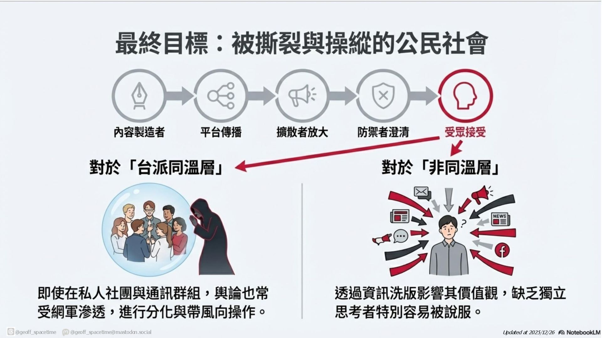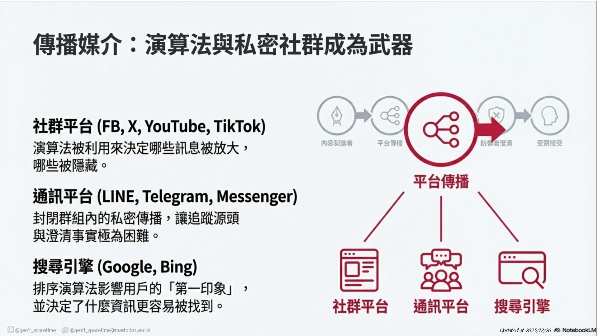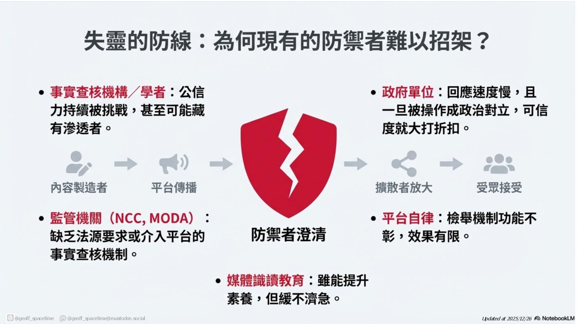 這份簡報剖析網路資訊戰傳播鏈,揭露內容產製者與擴散者(如網軍)如何利用平台演算法放大假訊息。針對現有防禦機制(如政府、查核單位)功能受限的困境,提出社群反擊策略:透過支持友軍內容、優化搜尋引擎與AI詢答 (SEO/AAO)、識別與封鎖網軍以及在私人群組中進行手動或自動澄清,以鞏固群眾信任並跨越同溫層傳遞正確資訊,。