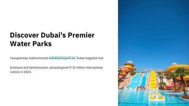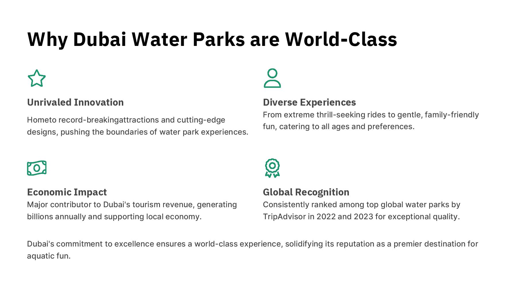 to Dubai's tourism revenue, generating billions annually and supporting local economy. Unrivaled Innovation Global Recognition Consistently ranked among top global water parks by TripAdvisor in 2022 and 2023 for exceptional quality. Diverse Experiences From extreme thrill-seeking rides to gentle, family-friendly fun, catering to all ages and preferences. Hometo record-breakingattractions and cutting-edge designs, pushing the boundaries of water park experiences. Dubai's commitment to excellence ensures a world-class experience, solidifying its reputation as a premier destination for aquatic fun.
