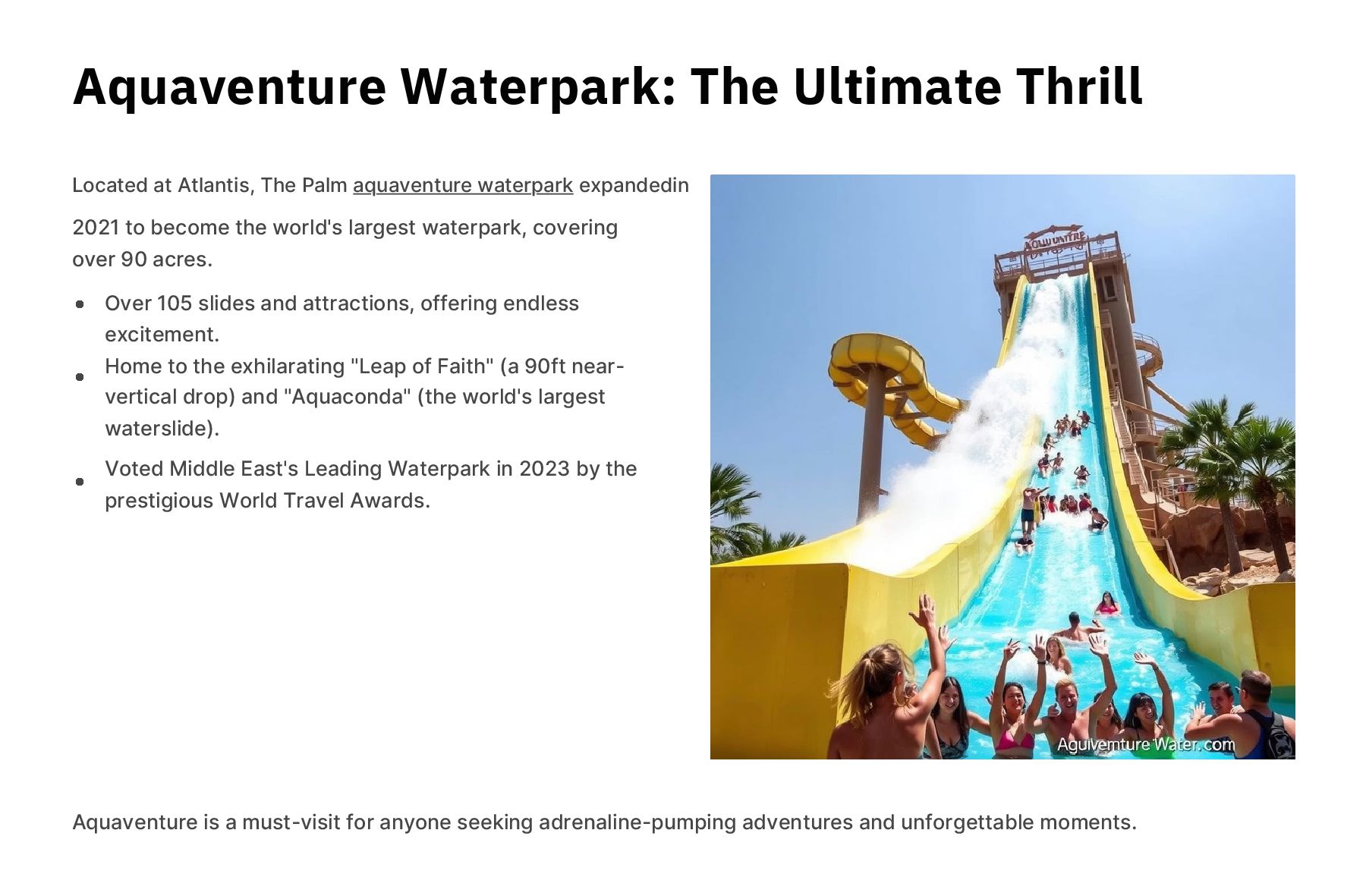 aquaventure waterpark expandedin 2021 to become the world's largest waterpark, covering over 90 acres. Over 105 slides and attractions, offering endless excitement. Home to the exhilarating "Leap of Faith" (a 90ft near- vertical drop) and "Aquaconda" (the world's largest waterslide). Voted Middle East's Leading Waterpark in 2023 by the prestigious World Travel Awards. Aquaventure is a must-visit for anyone seeking adrenaline-pumping adventures and unforgettable moments.