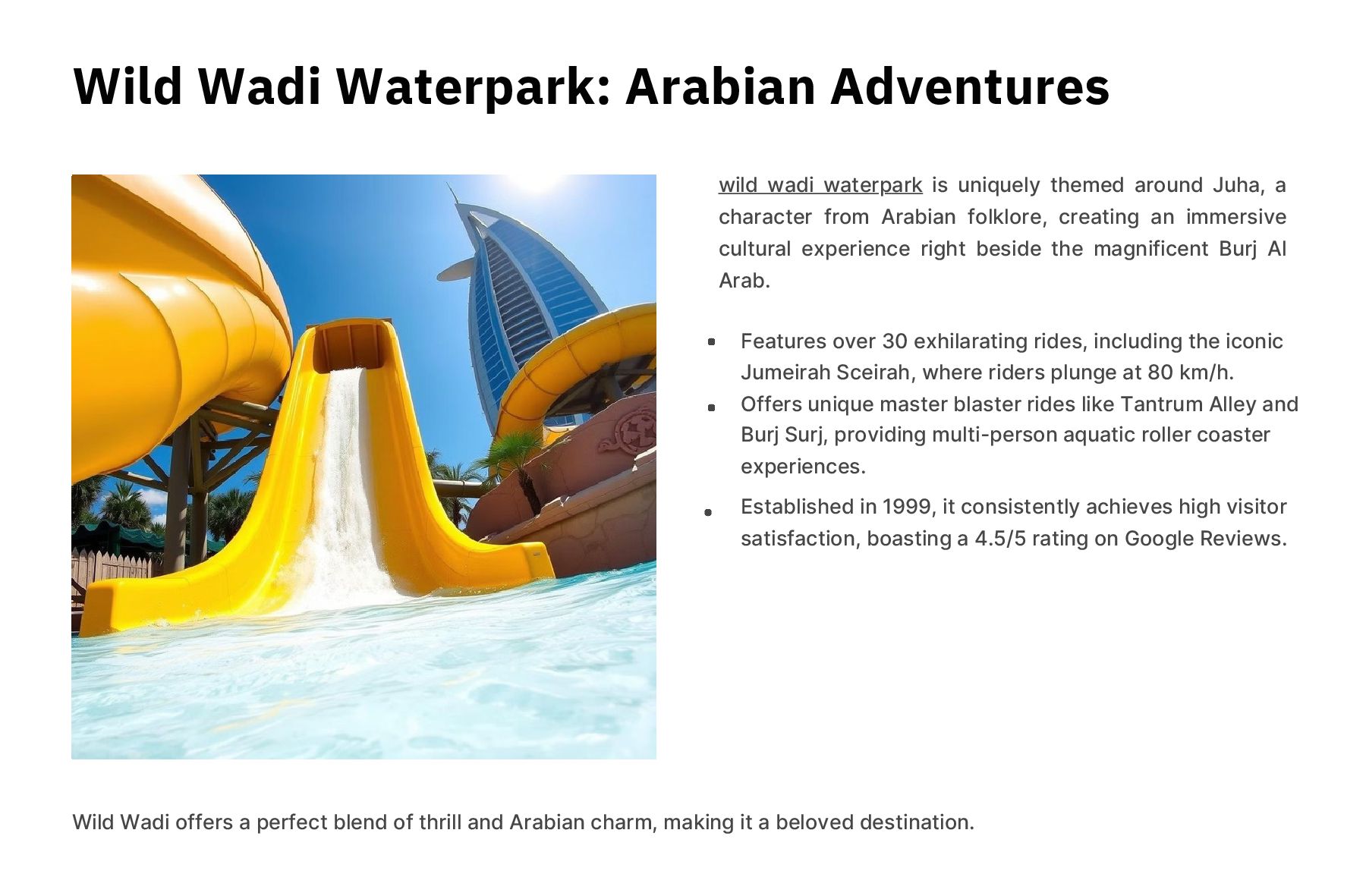 blend of thrill and Arabian charm, making it a beloved destination. wild wadi waterpark is uniquely themed around Juha, a character from Arabian folklore, creating an immersive cultural experience right beside the magnificent Burj Al Arab. Features over 30 exhilarating rides, including the iconic Jumeirah Sceirah, where riders plunge at 80 km/h. Offers unique master blaster rides like Tantrum Alley and Burj Surj, providing multi-person aquatic roller coaster experiences. Established in 1999, it consistently achieves high visitor satisfaction, boasting a 4.5/5 rating on Google Reviews.