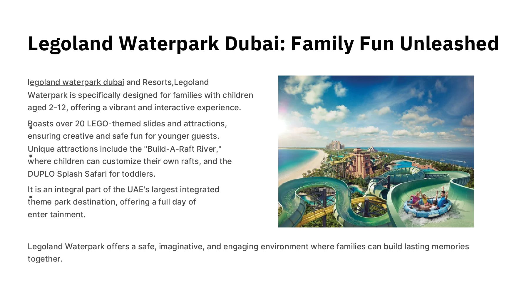 Resorts,Legoland Waterpark is specifically designed for families with children aged 2-12, offering a vibrant and interactive experience. Boasts over 20 LEGO-themed slides and attractions, ensuring creative and safe fun for younger guests. Unique attractions include the "Build-A-Raft River," where children can customize their own rafts, and the DUPLO Splash Safari for toddlers. It is an integral part of the UAE's largest integrated theme park destination, offering a full day of enter tainment. Legoland Waterpark offers a safe, imaginative, and engaging environment where families can build lasting memories together.