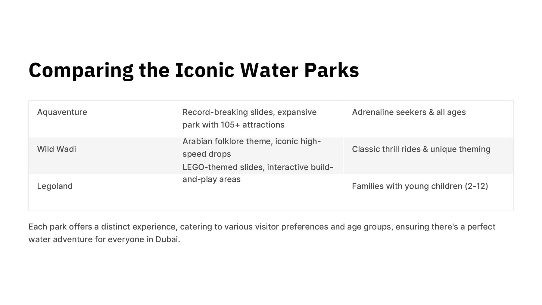 with 105+ attractions Arabian folklore theme, iconic high- speed drops LEGO-themed slides, interactive build- and-play areas Adrenaline seekers & all ages Wild Wadi Classic thrill rides & unique theming Legoland Families with young children (2-12) Each park offers a distinct experience, catering to various visitor preferences and age groups, ensuring there's a perfect water adventure for everyone in Dubai.