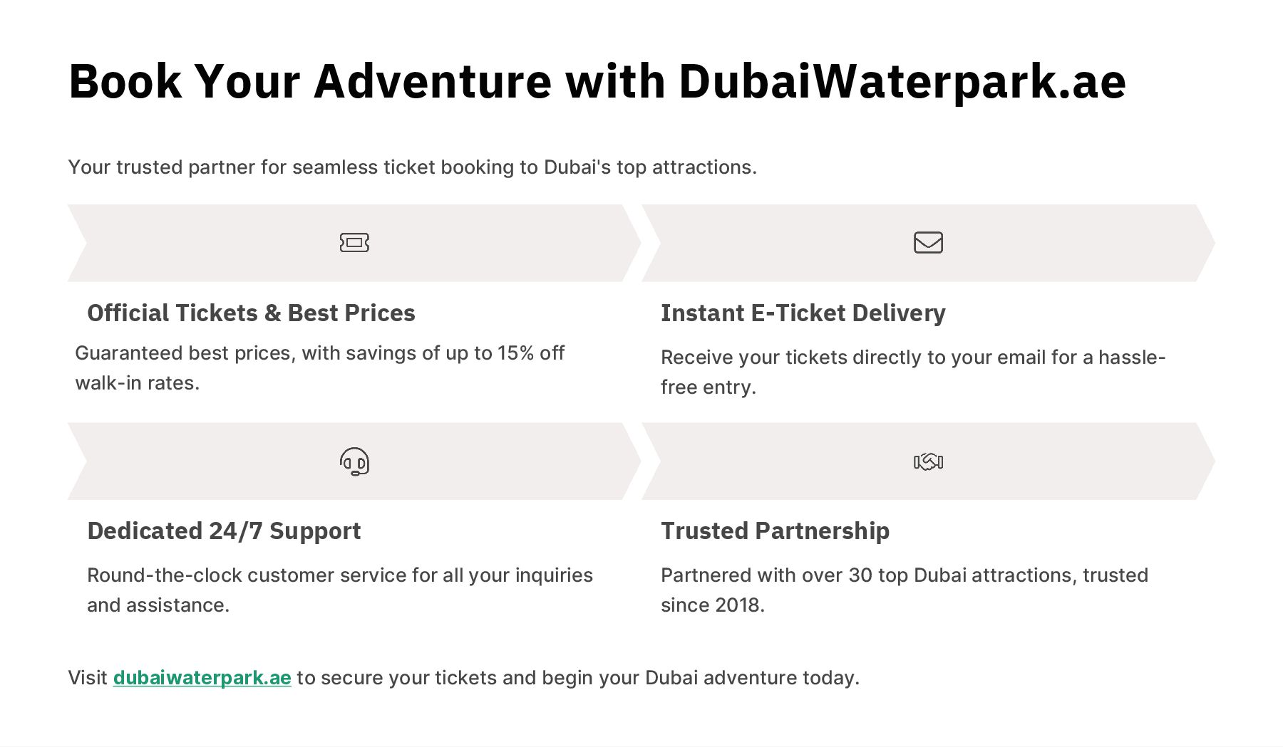 of up to 15% off walk-in rates. Your trusted partner for seamless ticket booking to Dubai's top attractions. Round-the-clock customer service for all your inquiries and assistance. Partnered with over 30 top Dubai attractions, trusted since 2018. Visit dubaiwaterpark.ae to secure your tickets and begin your Dubai adventure today. Receive your tickets directly to your email for a hassle- free entry. Dedicated 24/7 Support Official Tickets & Best Prices Trusted Partnership Instant E-Ticket Delivery