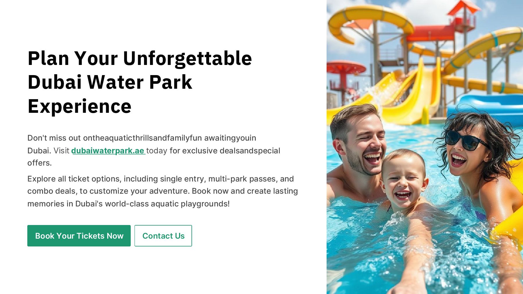 ontheaquaticthrillsandfamilyfun awaitingyouin Dubai. Visit dubaiwaterpark.ae today for exclusive dealsandspecial offers. Explore all ticket options, including single entry, multi-park passes, and combo deals, to customize your adventure. Book now and create lasting memories in Dubai's world-class aquatic playgrounds! Book Your Tickets Now Contact Us