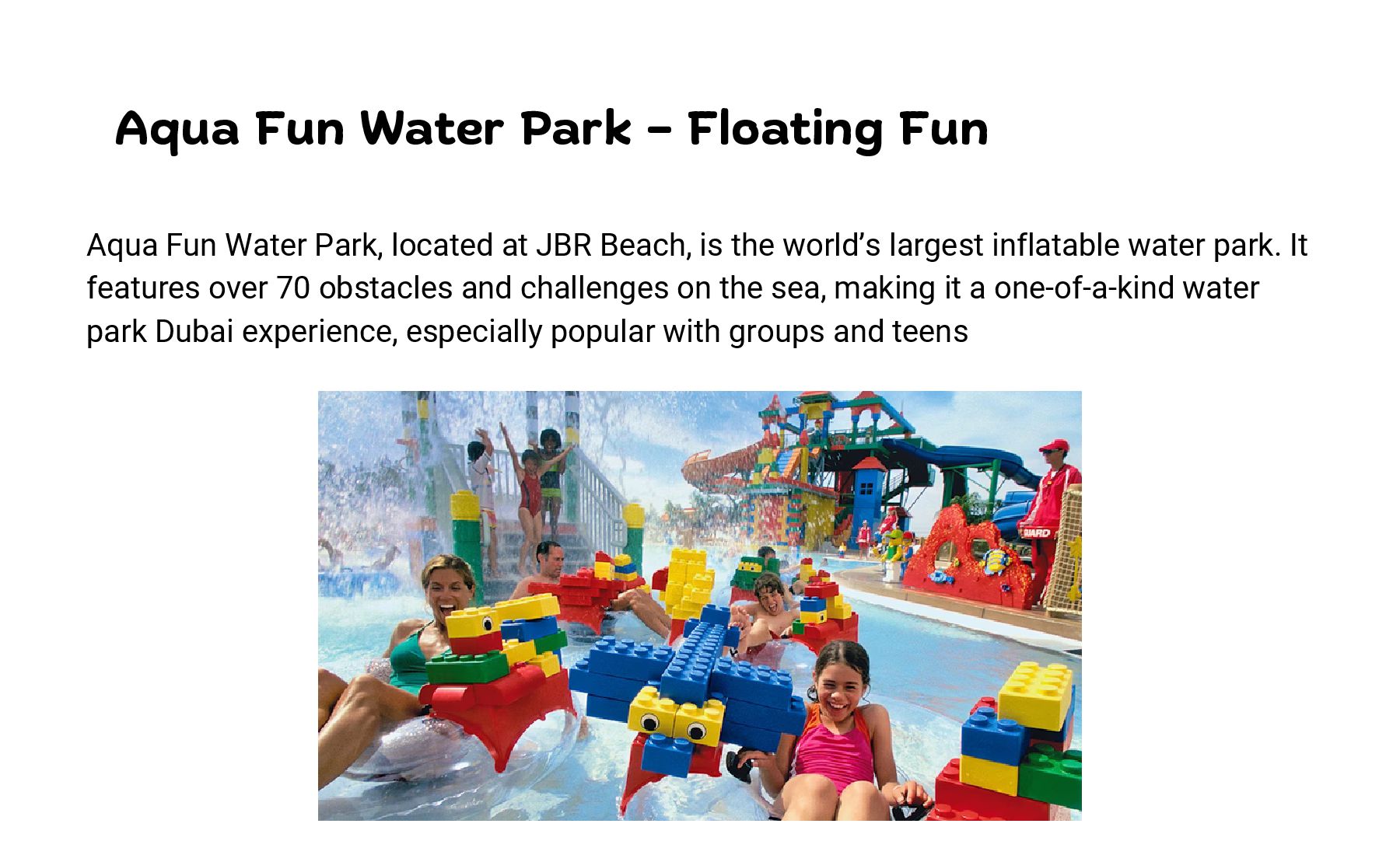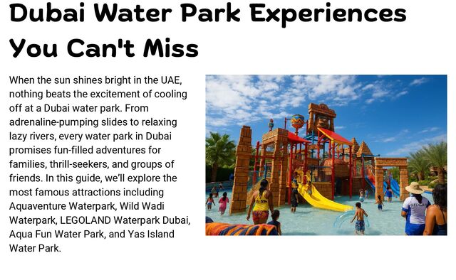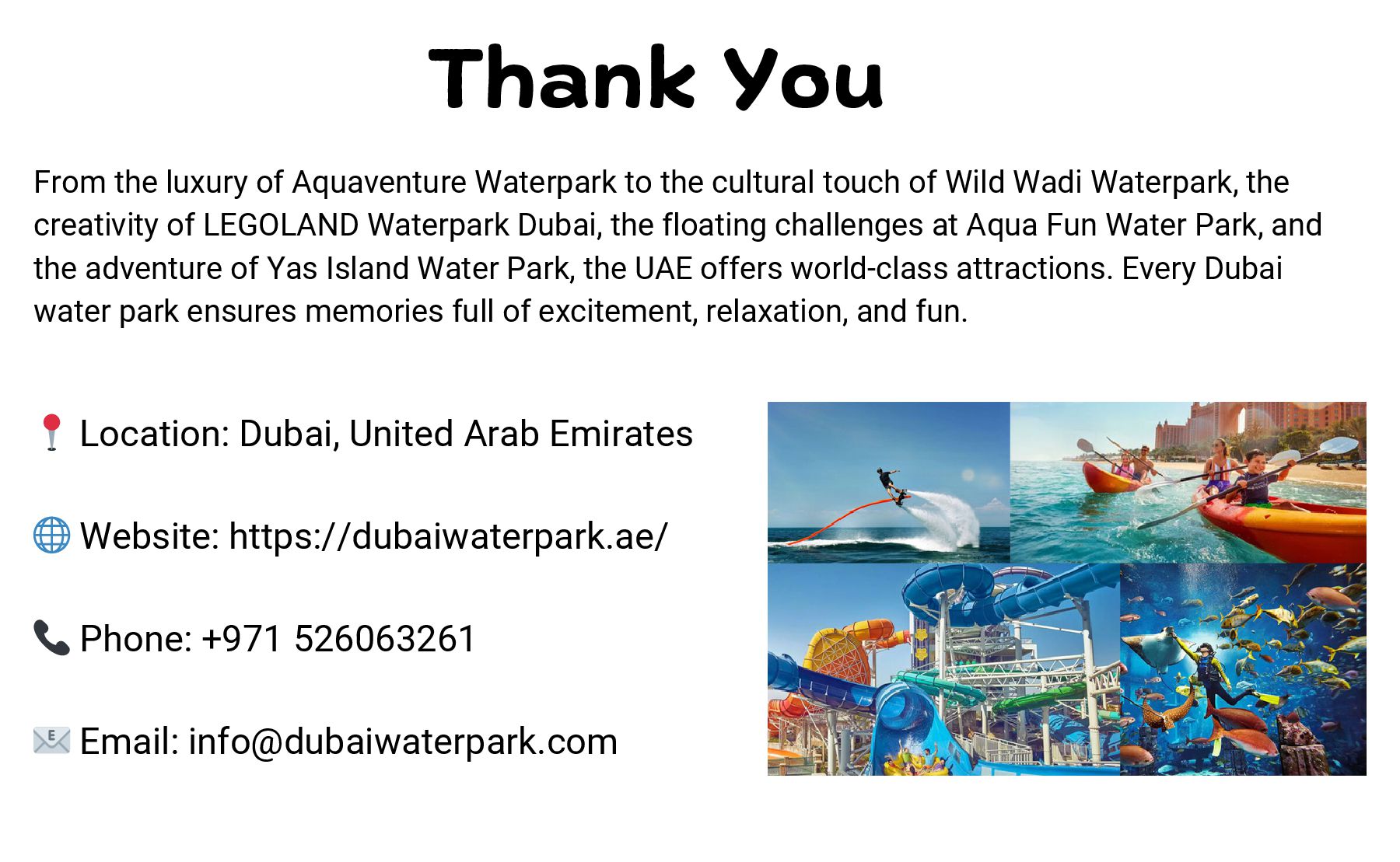 cultural touch of Wild Wadi Waterpark, the creativity of LEGOLAND Waterpark Dubai, the floating challenges at Aqua Fun Water Park, and the adventure of Yas Island Water Park, the UAE offers world-class attractions. Every Dubai water park ensures memories full of excitement, relaxation, and fun. 📍 Location: Dubai, United Arab Emirates 🌐 Website: https://dubaiwaterpark.ae/ 📞 Phone: +971 526063261 📧 Email: [email protected]