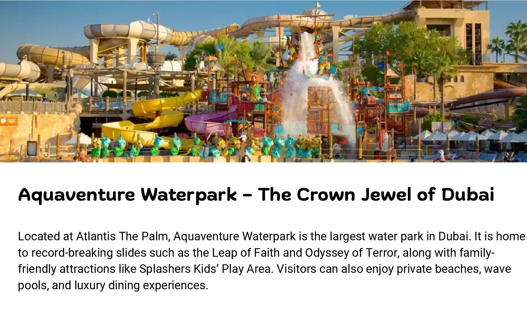 Atlantis The Palm, Aquaventure Waterpark is the largest water park in Dubai. It is home to record-breaking slides such as the Leap of Faith and Odyssey of Terror, along with family- friendly attractions like Splashers Kids’ Play Area. Visitors can also enjoy private beaches, wave pools, and luxury dining experiences.