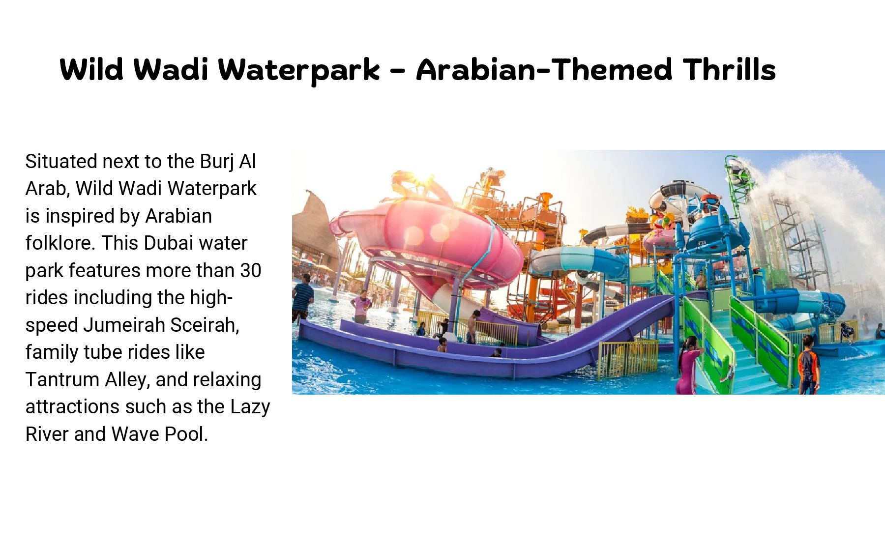 Burj Al Arab, Wild Wadi Waterpark is inspired by Arabian folklore. This Dubai water park features more than 30 rides including the high- speed Jumeirah Sceirah, family tube rides like Tantrum Alley, and relaxing attractions such as the Lazy River and Wave Pool.