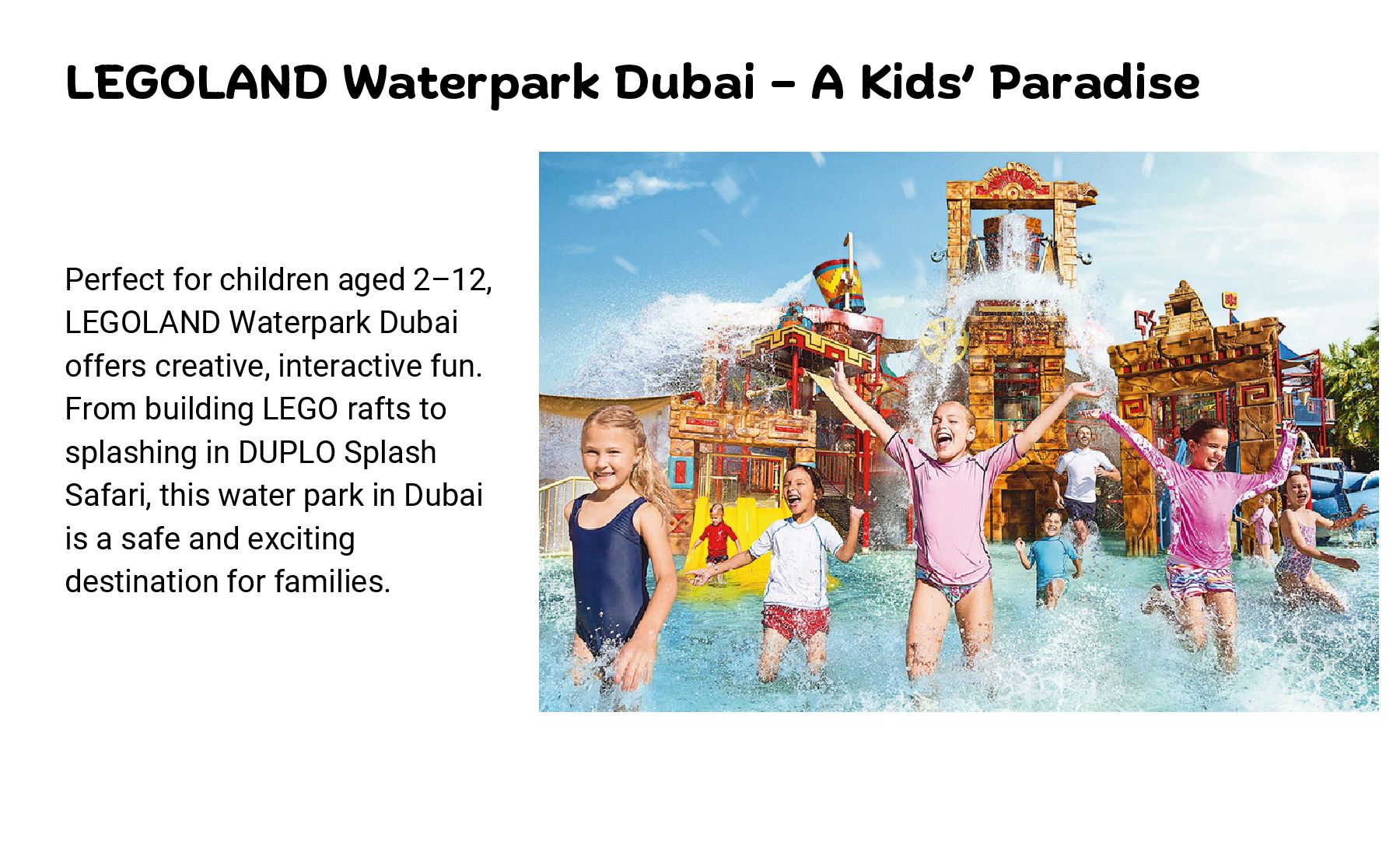 aged 2–12, LEGOLAND Waterpark Dubai offers creative, interactive fun. From building LEGO rafts to splashing in DUPLO Splash Safari, this water park in Dubai is a safe and exciting destination for families.