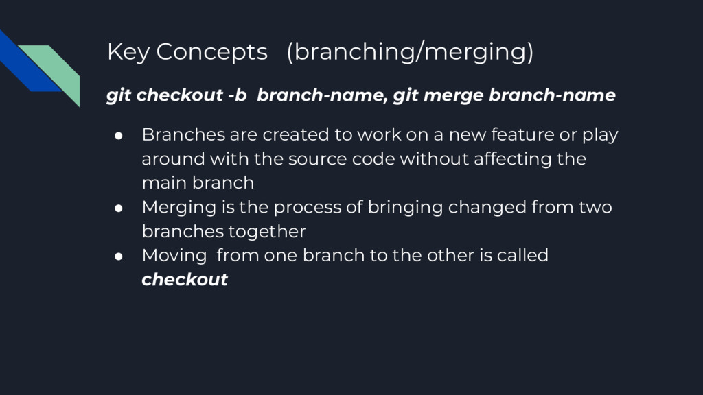 • Branches are created to work on a new feature or play around with the source code without affecting the main branch • Merging is the process of bringing changed from two branches together • Moving from one branch to the other is called checkout