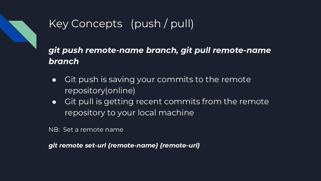 pull remote-name branch • Git push is saving your commits to the remote repository(online) • Git pull is getting recent commits from the remote repository to your local machine NB: Set a remote name git remote set-url {remote-name} {remote-url}