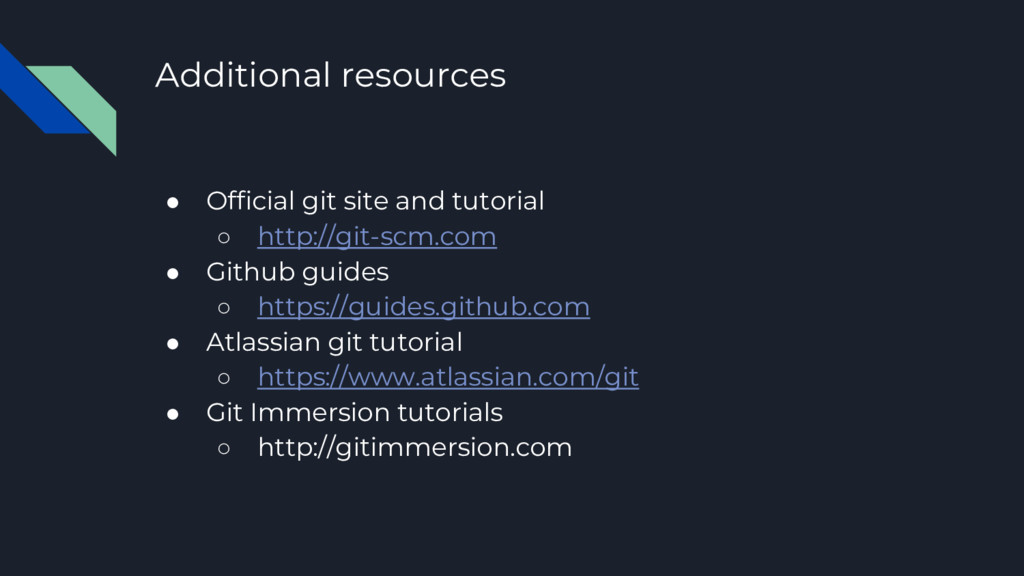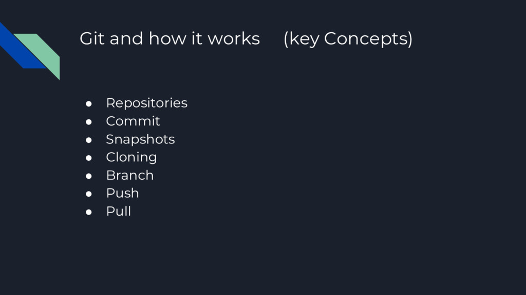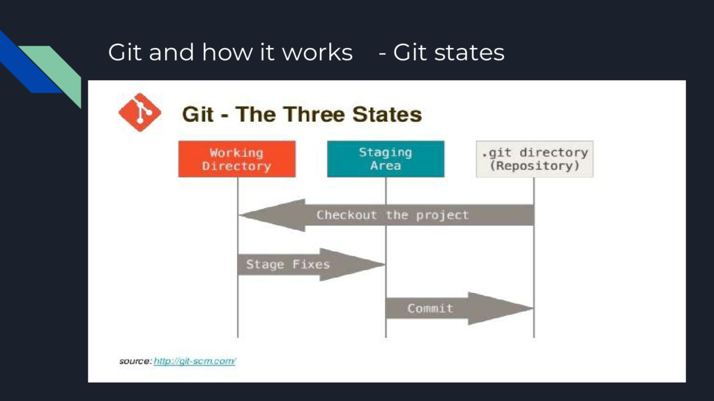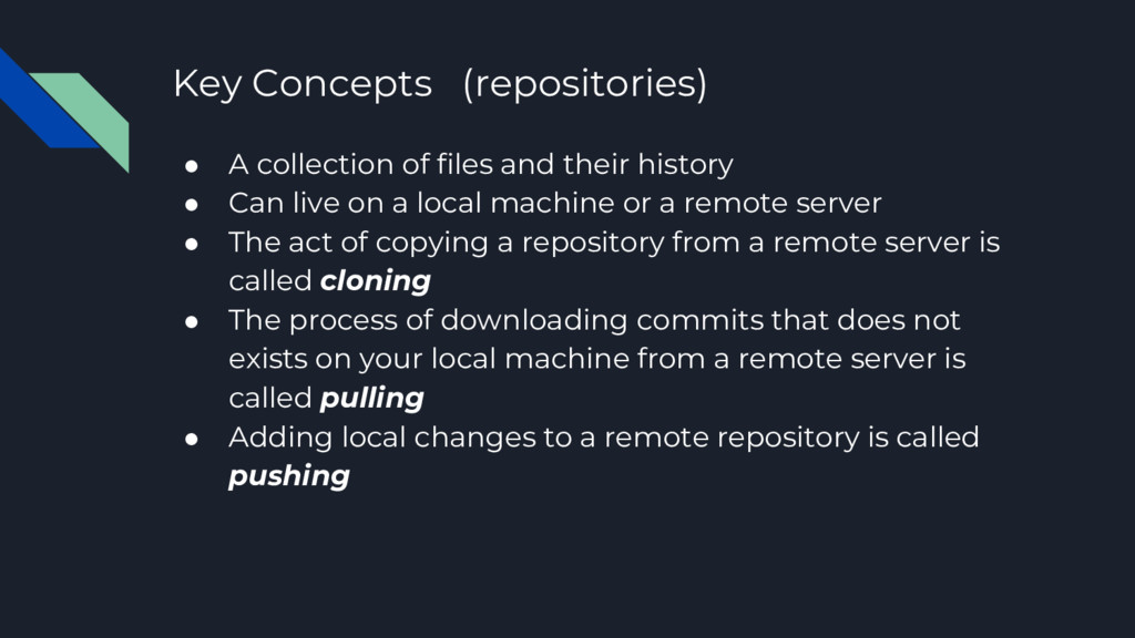 history • Can live on a local machine or a remote server • The act of copying a repository from a remote server is called cloning • The process of downloading commits that does not exists on your local machine from a remote server is called pulling • Adding local changes to a remote repository is called pushing