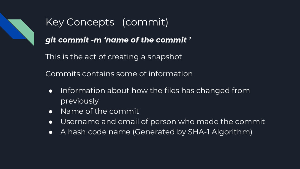 ’ This is the act of creating a snapshot Commits contains some of information • Information about how the files has changed from previously • Name of the commit • Username and email of person who made the commit • A hash code name (Generated by SHA-1 Algorithm)