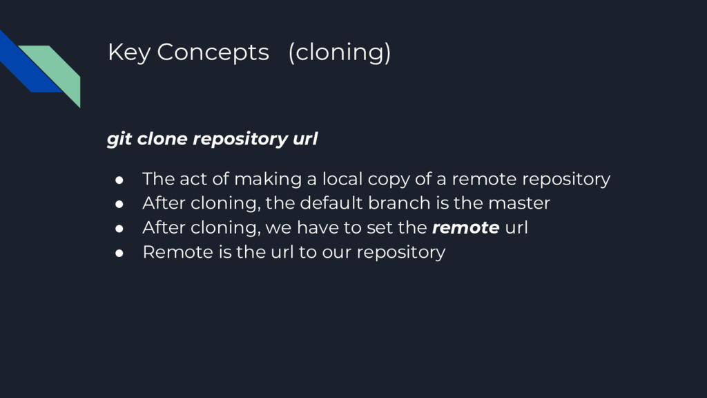 of making a local copy of a remote repository • After cloning, the default branch is the master • After cloning, we have to set the remote url • Remote is the url to our repository