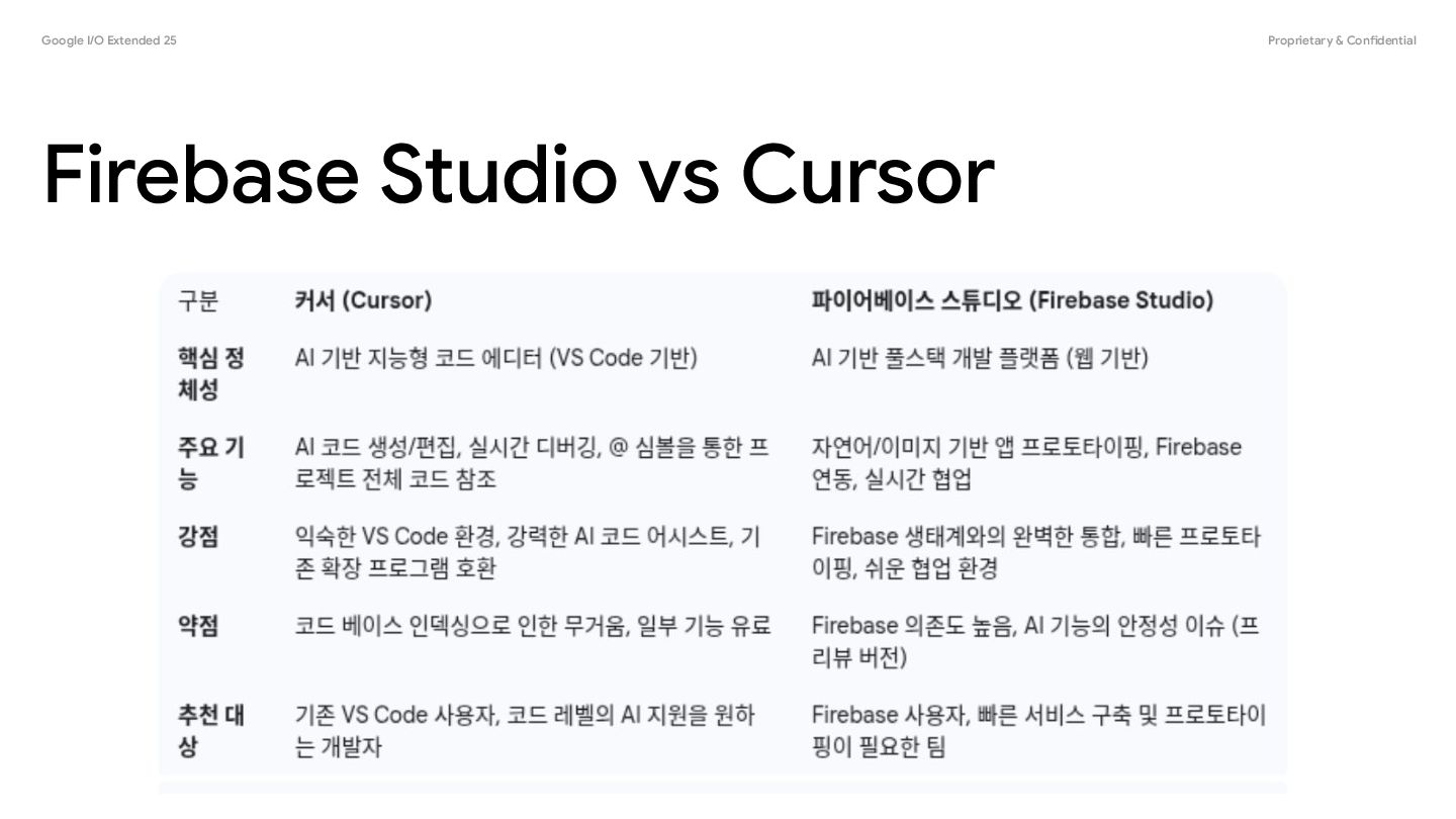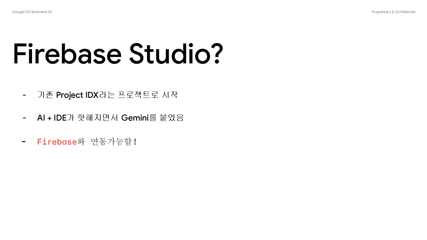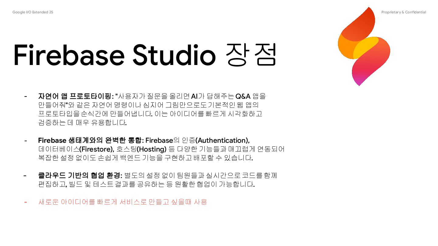 - 자연어 앱 프로토타이핑: "사용자가 질문을 올리면 AI가 답해주는 Q&A 앱을 만들어줘"와 같은 자연어 명령이나 심지어 그림만으로도 기본적인 웹 앱의 프로토타입을 순식간에 만들어냅니다. 이는 아이디어를 빠르게 시각화하고 검증하는 데 매우 유용합니다. - Firebase 생태계와의 완벽한 통합: Firebase의 인증(Authentication), 데이터베이스(Firestore), 호스팅(Hosting) 등 다양한 기능들과 매끄럽게 연동되어 복잡한 설정 없이도 손쉽게 백엔드 기능을 구현하고 배포할 수 있습니다. - 클라우드 기반의 협업 환경: 별도의 설정 없이 팀원들과 실시간으로 코드를 함께 편집하고, 빌드 및 테스트 결과를 공유하는 등 원활한 협업이 가능합니다. - 새로운 아이디어를 빠르게 서비스로 만들고 싶을때 사용
