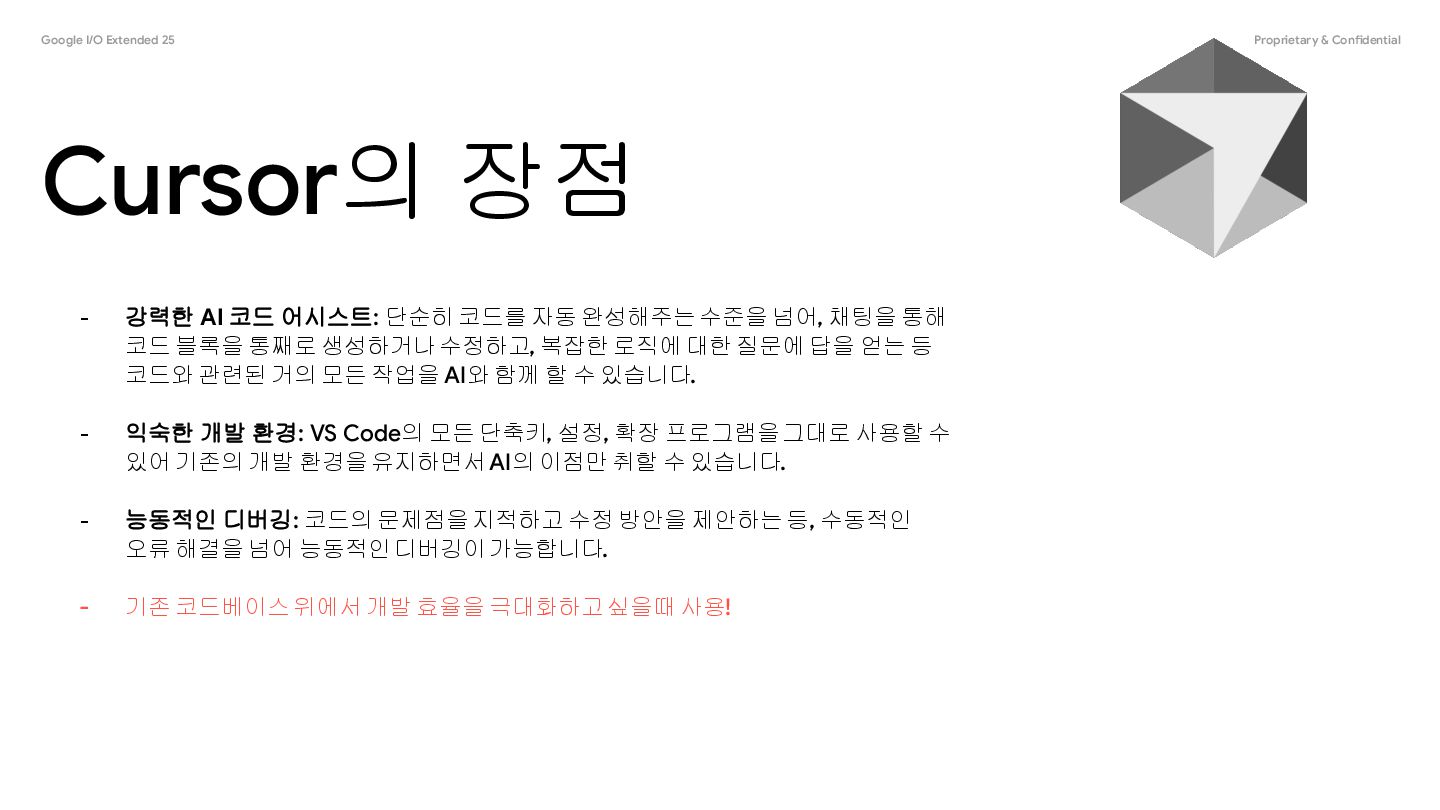 코드 어시스트: 단순히 코드를 자동 완성해주는 수준을 넘어, 채팅을 통해 코드 블록을 통째로 생성하거나 수정하고, 복잡한 로직에 대한 질문에 답을 얻는 등 코드와 관련된 거의 모든 작업을 AI와 함께 할 수 있습니다. - 익숙한 개발 환경: VS Code의 모든 단축키, 설정, 확장 프로그램을 그대로 사용할 수 있어 기존의 개발 환경을 유지하면서 AI의 이점만 취할 수 있습니다. - 능동적인 디버깅: 코드의 문제점을 지적하고 수정 방안을 제안하는 등, 수동적인 오류 해결을 넘어 능동적인 디버깅이 가능합니다. - 기존 코드베이스 위에서 개발 효율을 극대화하고 싶을때 사용! Cursor의 장점