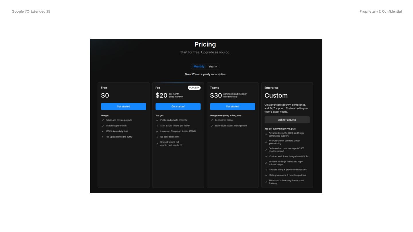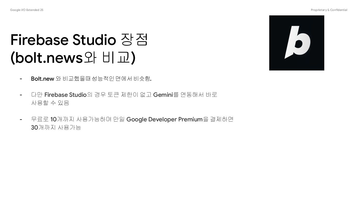 (bolt.news와 비교) - Bolt.new 와 비교했을때 성능적인 면에서 비슷함. - 다만 Firebase Studio의 경우 토큰 제한이 없고 Gemini를 연동해서 바로 사용할 수 있음 - 무료로 10개까지 사용가능하며 만일 Google Developer Premium을 결제하면 30개까지 사용가능