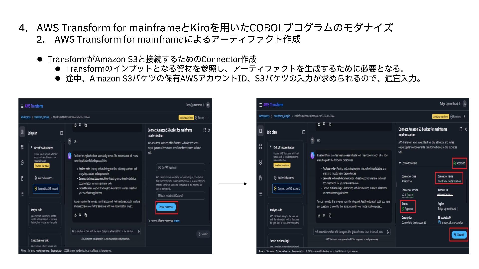 AWS Transform for mainframe によるアーティファクト作成 ⚫ Transform がAmazon S3 と接続するための Connector 作成 ⚫ Transform のインプットとなる資材を参照し、アーティファクトを生成するために必要となる。 ⚫ 途中、 Amazon S3 バケツの保有 AWS アカウント ID 、 S3 バケツの入力が求められるので、適宜入力。