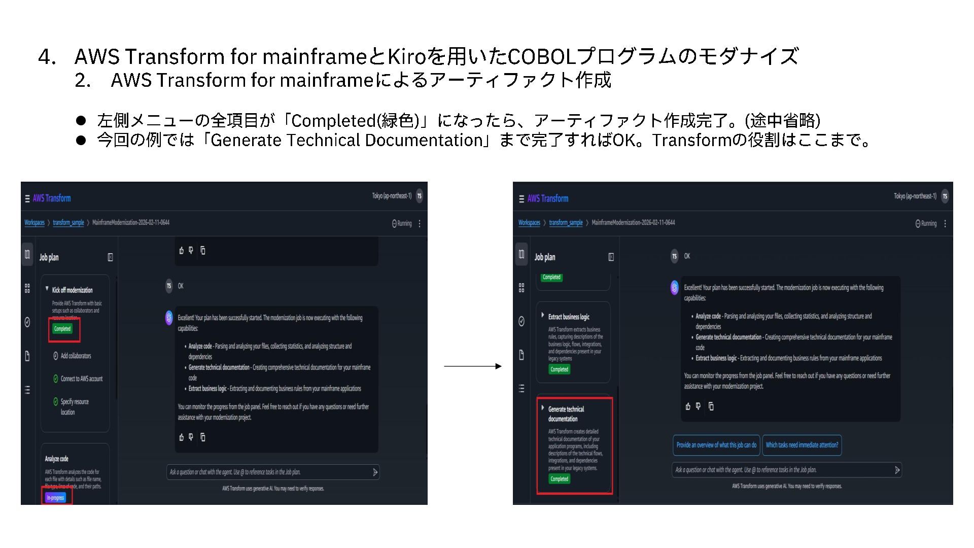 AWS Transform for mainframe によるアーティファクト作成 ⚫ 左側メニューの全項目が「 Completed( 緑色)」になったら、アーティファクト作成完了。 (途中省略) ⚫ 今回の例では「 Generate Technical Documentation 」まで完了すれば OK。 Transform の役割はここまで。