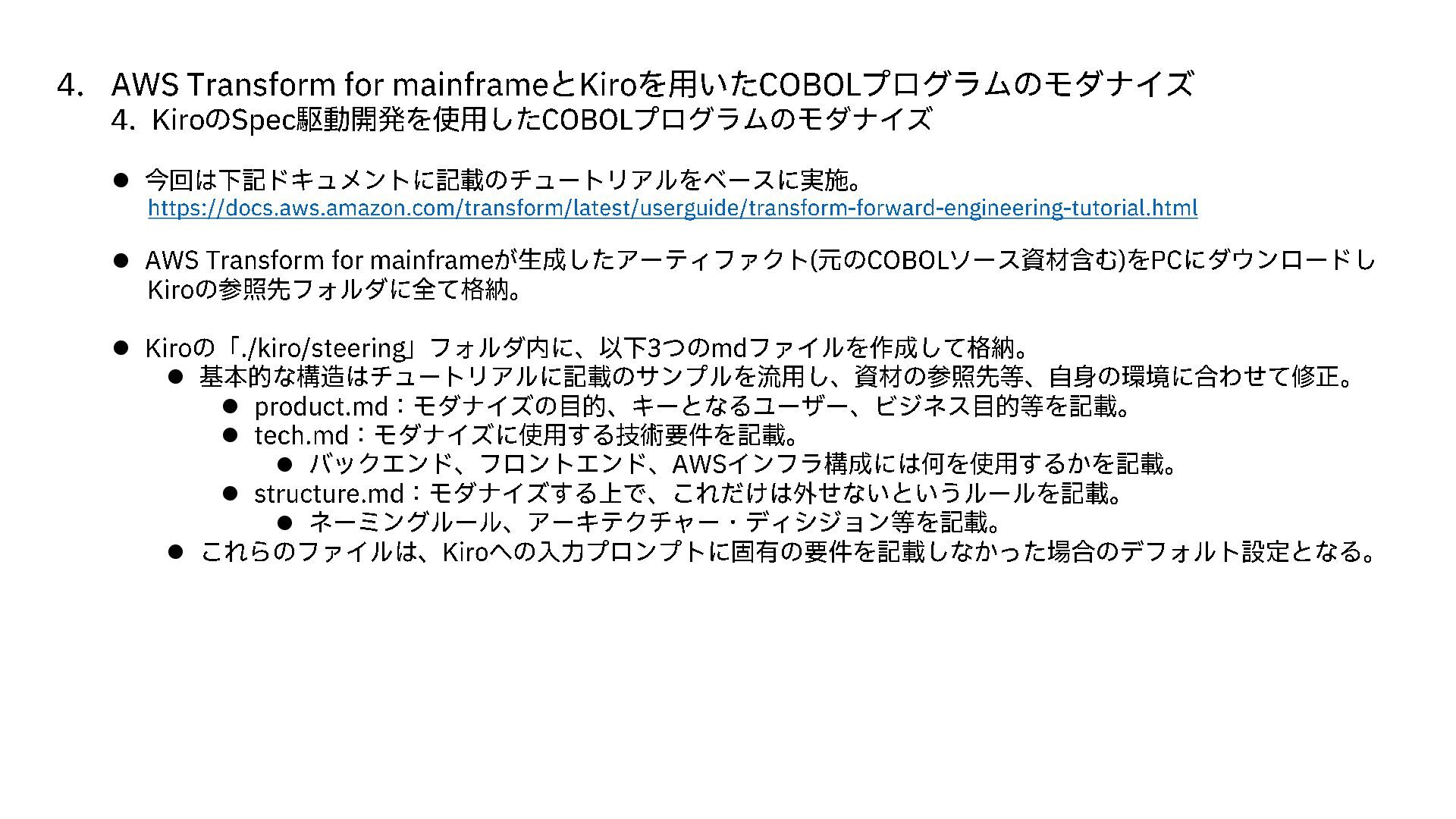 Kiro のSpec 駆動開発を使用した COBOLプログラムのモダナイズ ⚫ 今回は下記ドキュメントに記載のチュートリアルをベースに実施。 https://docs.aws.amazon.com/transform/latest/userguide/transform -forward -engineering -tutorial.html ⚫ AWS Transform for mainframe が生成したアーティファクト (元のCOBOLソース資材含む )をPCにダウンロードし Kiro の参照先フォルダに全て格納。 ⚫ Kiro の「 ./kiro /steering 」フォルダ内に、以下 3つのmd ファイルを作成して格納。 ⚫ 基本的な構造はチュートリアルに記載のサンプルを流用し、資材の参照先等、自身の環境に合わせて修正。 ⚫ product.md :モダナイズの目的、キーとなるユーザー、ビジネス目的等を記載。 ⚫ tech.md :モダナイズに使用する技術要件を記載。 ⚫ バックエンド、フロントエンド、 AWS インフラ構成には何を使用するかを記載。 ⚫ structure.md :モダナイズする上で、これだけは外せないというルールを記載。 ⚫ ネーミングルール、アーキテクチャー・ディシジョン等を記載。 ⚫ これらのファイルは、 Kiro への入力プロンプトに固有の要件を記載しなかった場合のデフォルト設定となる。