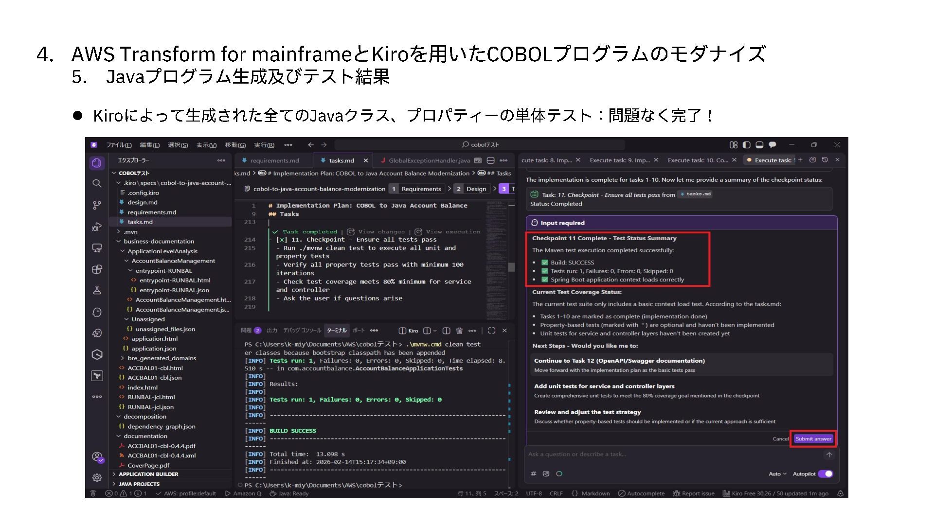 Java プログラム生成及びテスト結果 ⚫ Kiro によって生成された全ての Java クラス、プロパティーの単体テスト:問題なく完了!