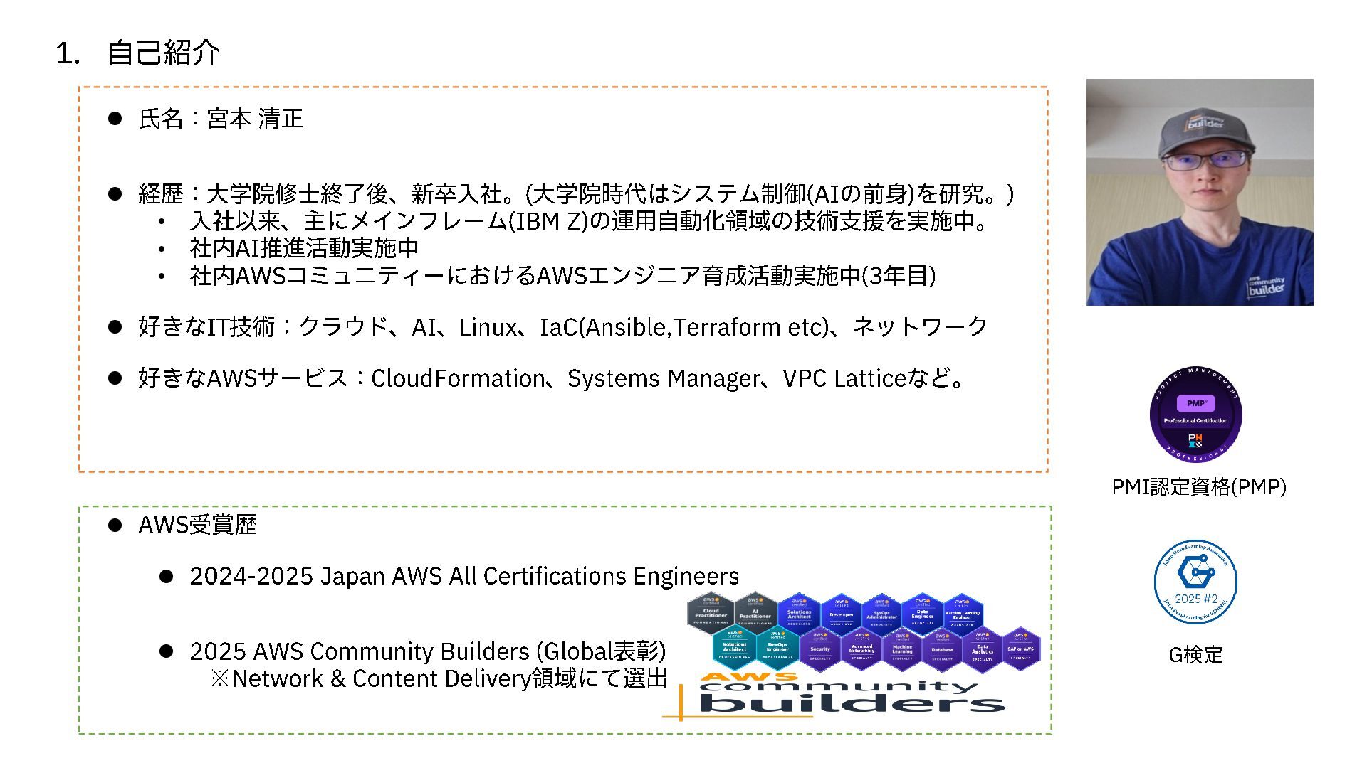 ) • 入社以来、主にメインフレーム (IBM Z) の運用自動化領域の技術支援を実施中。 • 社内AI 推進活動実施中 • 社内AWS コミュニティーにおける AWS エンジニア育成活動実施中 (3 年目) ⚫ 好きな IT 技術: クラウド 、 AI 、 Linux 、 IaC (Ansible,Terraform etc)、ネットワーク ⚫ 好きな AWS サービス: CloudFormation 、 Systems Manager 、 VPC Lattice など。 ⚫ AWS 受賞歴 ⚫ 2024 -2025 Japan AWS All Certifications Engineers ⚫ 2025 AWS Community Builders (Global 表彰) ※Network & Content Delivery 領域にて選出 PMI 認定資格(PMP) G検定