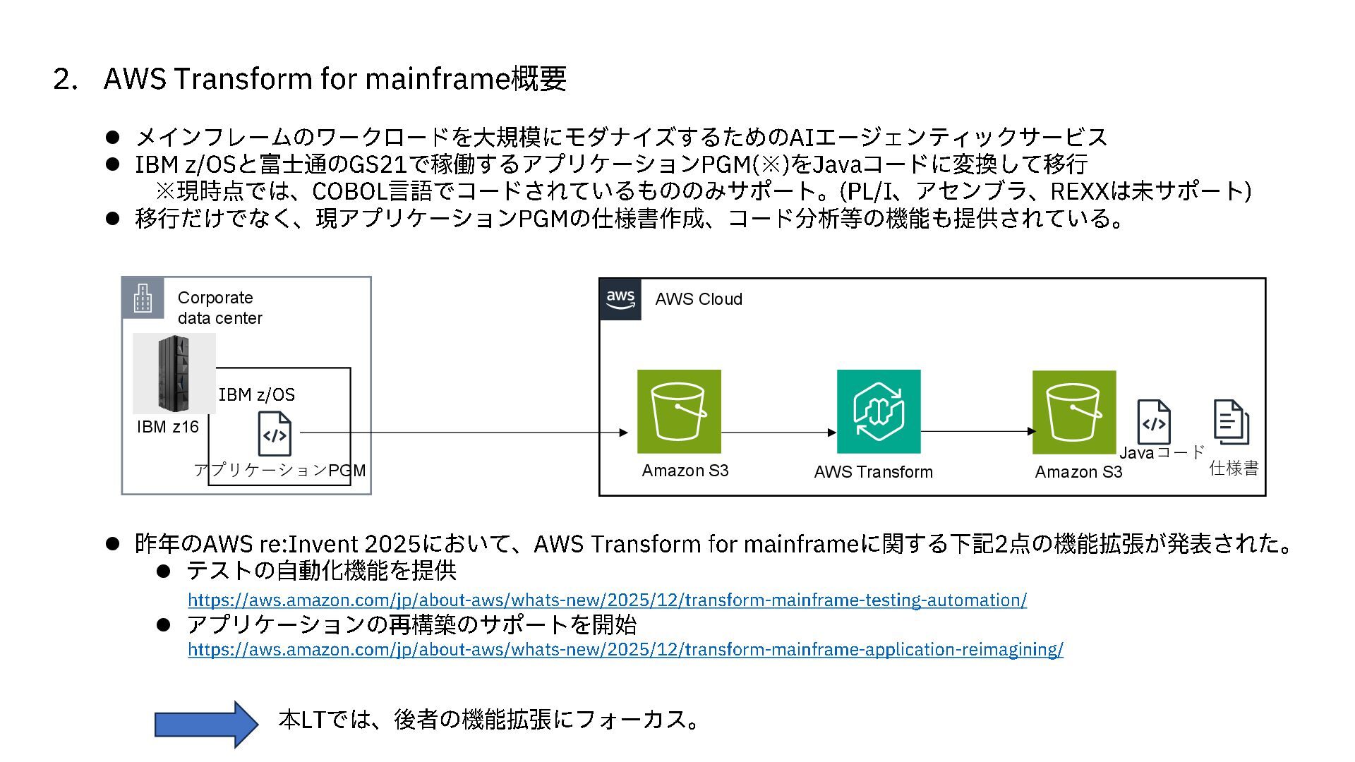 AI エージェンティックサービス ⚫ IBM z/OS と富士通の GS21 で稼働するアプリケーション PGM(※) をJava コードに変換して移行 ※現時点では、 COBOL言語でコードされているもののみサポート。 (PL/I 、アセンブラ、 REXX は未サポート ) ⚫ 移行だけでなく、現アプリケーション PGM の仕様書作成、コード分析等の機能も提供されている。 ⚫ 昨年のAWS re:Invent 2025 において、 AWS Transform for mainframe に関する下記 2点の機能拡張が発表された。 ⚫ テストの自動化機能を提供 https://aws.amazon.com/jp/about -aws/whats -new/2025/12/transform -mainframe -testing -automation/ ⚫ アプリケーションの再構築のサポートを開始 https://aws.amazon.com/jp/about -aws/whats -new/2025/12/transform -mainframe -application -reimagining/ 本LTでは、後者の機能拡張にフォーカス。 AWS Transform アプリケーションPGM AWS Cloud Amazon S3 Amazon S3 Corporate data center Javaコード 仕様書 IBM z16