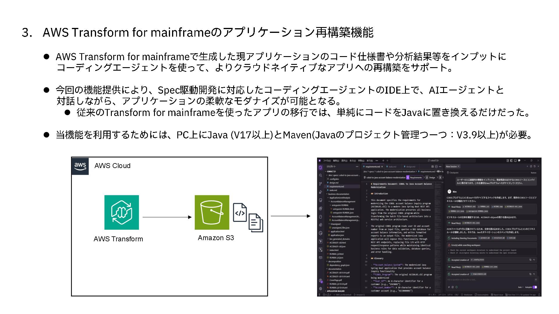 mainframe で生成した現アプリケーションのコード仕様書や分析結果等をインプットに コーディングエージェントを使って、よりクラウドネイティブなアプリへの再構築をサポート。 ⚫ 今回の機能提供により、 Spec 駆動開発に対応したコーディングエージェントの IDE 上で、 AI エージェントと 対話しながら、アプリケーションの柔軟なモダナイズが可能となる。 ⚫ 従来のTransform for mainframe を使ったアプリの移行では、単純にコードを Java に置き換えるだけだった。 ⚫ 当機能を利用するためには、 PC上にJava (V17 以上)と Maven(Java のプロジェクト管理つーつ: V3.9 以上)が必要。 AWS Cloud AWS Transform Amazon S3