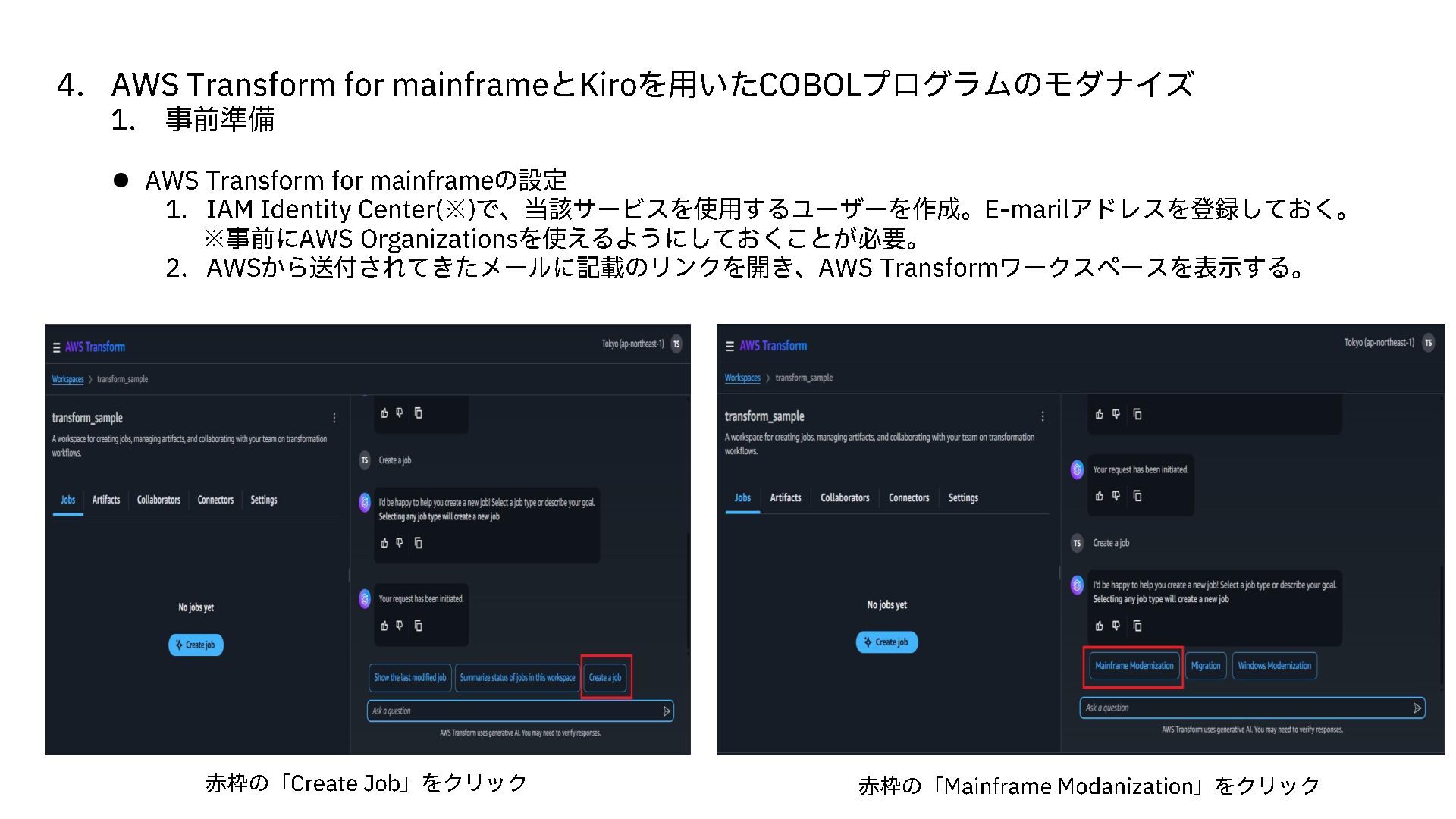 事前準備 ⚫ AWS Transform for mainframe の設定 1. IAM Identity Center(※) で、当該サービスを使用するユーザーを作成。 E-maril アドレスを登録しておく。 ※事前にAWS Organizations を使えるようにしておくことが必要。 2. AWS から送付されてきたメールに記載のリンクを開き、 AWS Transform ワークスペースを表示する。 赤枠の「 Create Job 」をクリック 赤枠の「 Mainframe Modanization 」をクリック